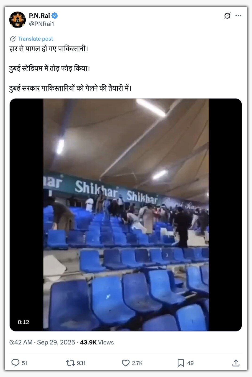 कुछ लोगों की मानें तो ये वीडियो भारत और पाकिस्तान के बीच हुए एशिया कप 2025 के फाइनल मुकाबले के बाद का है. लोगों का कहना है कि वीडियो में नजर आ रहे लोग पाकिस्तानी क्रिकेट फैंस हैं जो भारत की जीत से बौखला गए. वीडियो को एक्स पर शेयर करते हुए एक व्यक्ति ने लिखा, “हार से पागल हो गए पाकिस्तानी. दुबई स्टेडियम में तोड़ फोड़ किया.”