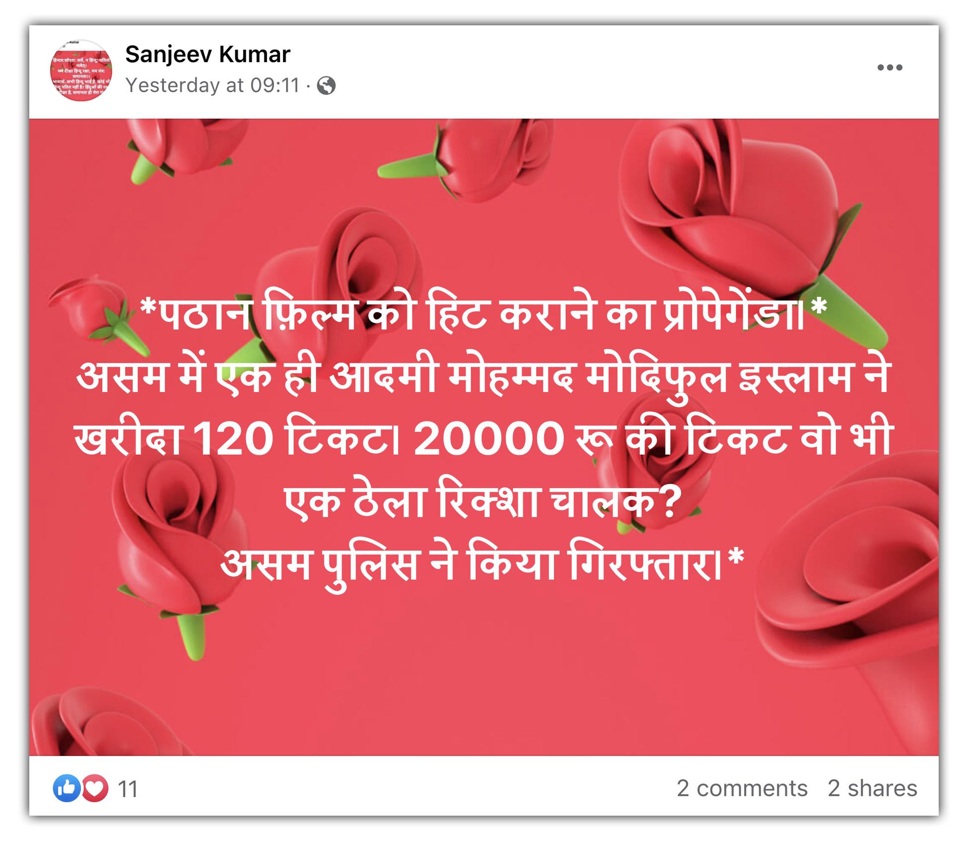 इन सबके बीच, सोशल मीडिया पर कुछ लोग आरोप लगा रहे हैं कि फिल्म 'पठान' को हिट कराने के लिए एक प्रोपेगैंडा चलाया जा रहा है. इसका उदाहरण देते हुए कुछ लोग सोशल मीडिया पर लिख रहे हैं कि कि असम में एक मामूली ठेले वाले ने 'पठान' के 120 टिकट खरीद लिए. साथ ही, ये भी कहा जा रहा है कि इस ठेले वाले को असम पुलिस ने गिरफ्तार कर लिया है.