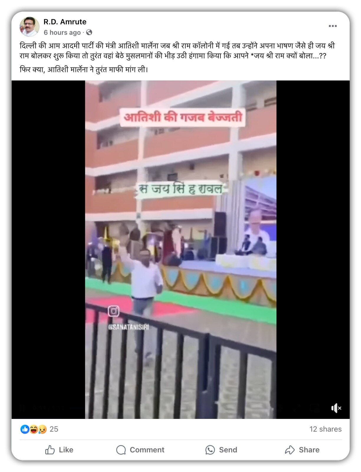 फेसबुक पर ये वीडियो शेयर करते हुए एक व्यक्ति ने लिखा, “दिल्ली की आम आदमी पार्टी की मंत्री आतिशी मार्लेना जब श्री राम कॉलोनी में गई तब उन्होंने अपना भाषण जैसे ही जय श्री राम बोलकर शुरू किया तो तुरंत वहां बेठे मुसलमानों की भीड़ उठी हंगामा किया कि आपने जय श्री राम क्यों बोला? फिर क्या, आतिशी मार्लेना ने तुरंत माफी मांग ली.”