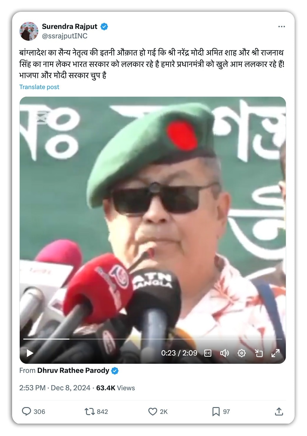 एक्स और फेसबुक पर ये वीडियो शेयर करते हुए यूजर्स लिख रहे हैं, “बांग्लादेश का सैन्य नेतृत्व की इतनी औक़ात हो गई कि श्री नरेंद्र मोदी अमित शाह और श्री राजनाथ सिंह का नाम लेकर भारत सरकार को ललकार रहे है हमारे प्रधानमंत्री को खुले आम ललकार रहे हैं!