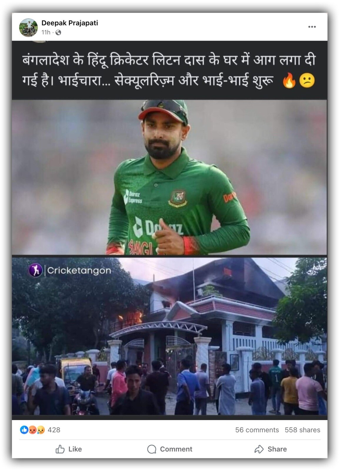 दोनों तस्वीरों को एक साथ पोस्ट करते हुए ये दावा किया जा रहा है कि अब बांग्लादेश क्रिकेट टीम के हिंदू खिलाड़ी लिटन के घर को आग के हवाले कर दिया गया है. फेसबुक पर इन तस्वीरों को पोस्ट करते हुए एक यूजर ने लिखा, "बंगलादेश के हिंदू क्रिकेटर लिटन दास के घर में आग लगा दी गई है। भाईचारा... सेक्यूलरिज़्म और भाई-भाई शुरू."