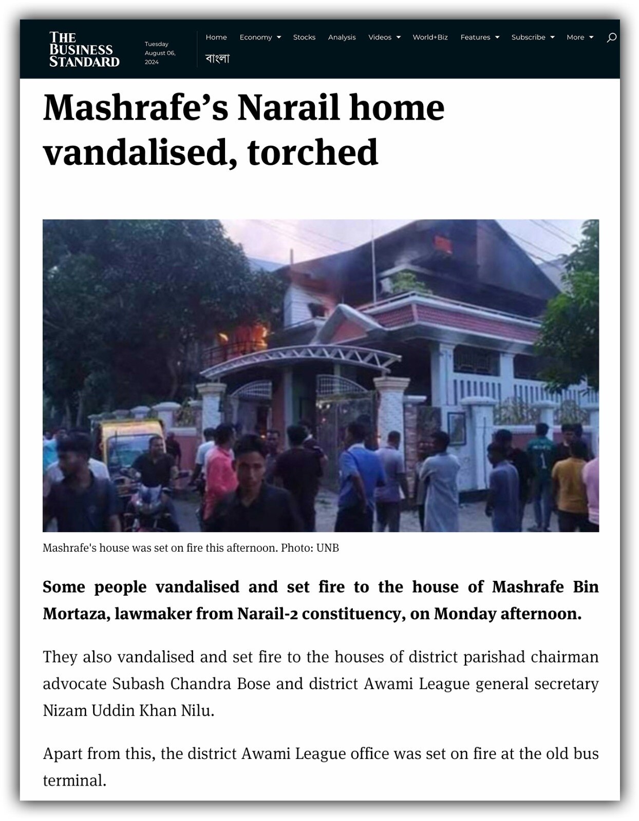 जलते हुए इसी घर की एक और तस्वीर हमें बांग्लादेशी मीडिया 'प्रोथोम आलो' की एक रिपोर्ट में मिली. इस रिपोर्ट में बताया गया है कि हसीना के पलायन के बाद जश्न मनाते लोगों के एक हुजूम ने महिषखोला नाम के इलाके में स्थित संसद के व्हिप मशरफी के घर पर हमला कर दिया. पहले घर में घुस कर तोड़-फोड़ की गई, और फिर उसे फूंक दिया गया. इतना ही नहीं, नाराइल जिले के आवामी लीग प्रेसिडेंट सुभाष चंद्र बोस और जिले के आवामी लीग कार्यालय पर भी हमले और तोड़फोड़ किए गये.