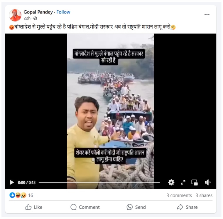 फेसबुक पर इसे शेयर करते हुए एक व्यक्ति ने लिखा, “बांग्लादेश से मुल्ले पहुंच रहे है बंगाल. मोदी सरकार अब तो आंख खोलो राष्ट्रपति शासन लागू करो.”