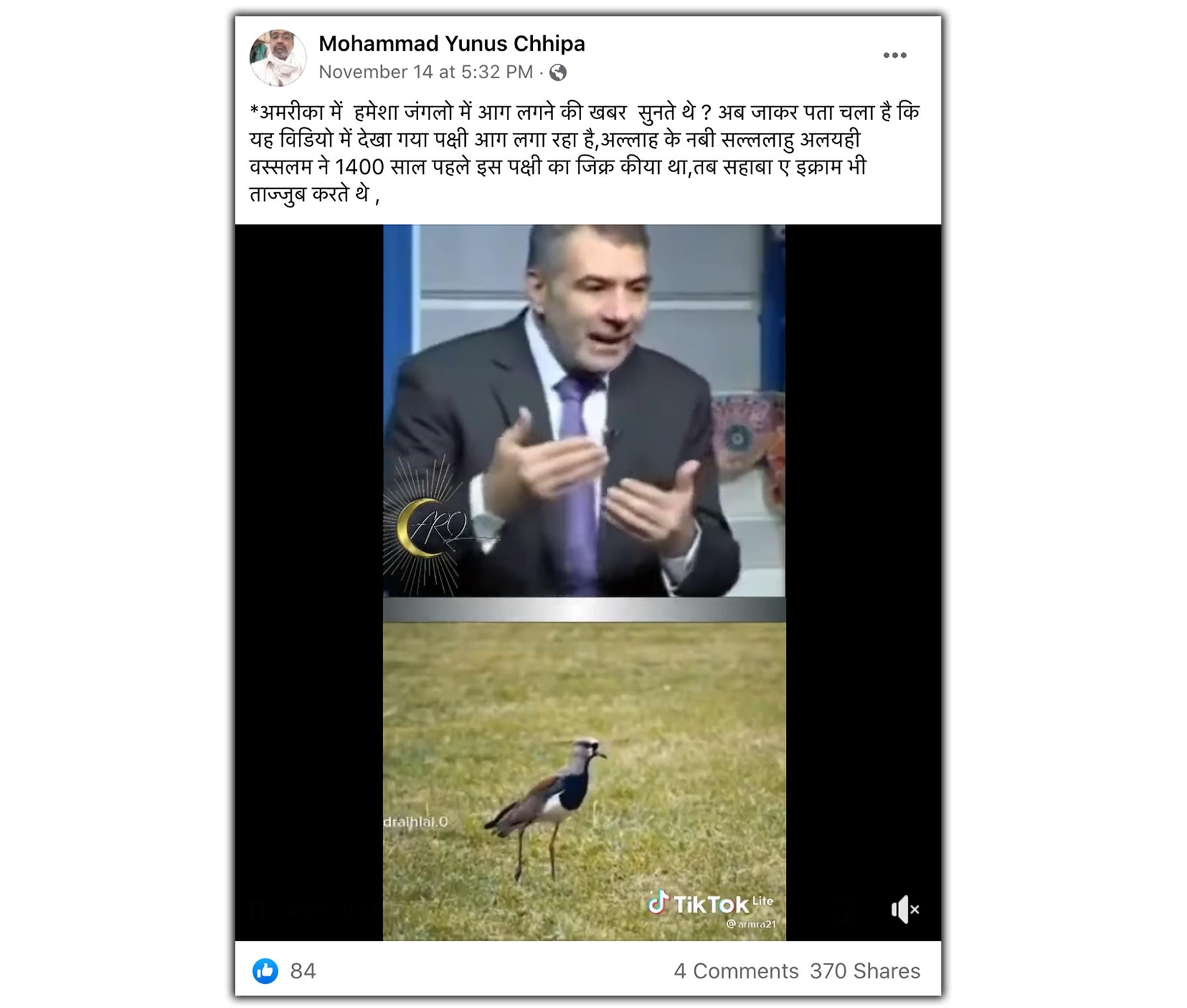 मिसाल के तौर पर, एक फेसबुक यूजर ने इस वीडियो को शेयर करते हुए लिखा, “अमरीका में हमेशा जंगलों में आग लगने की खबर सुनते थे? अब जाकर पता चला है कि यह वीडियो में देखा गया पक्षी आग लगा रहा है, अल्लाह के नबी सल्ललाहु अलयही वस्सलम ने 1400 साल पहले इस पक्षी का जिक्र किया था, तब सहाबा ए इक्राम भी ताज्जुब करते थे.” इसी वीडियो के साथ एक दूसरा वीडियो जोड़ा हुआ है जिसमें एक शख्स कोट-टाई लगाकर अरबी भाषा में कुछ बता रहा है.