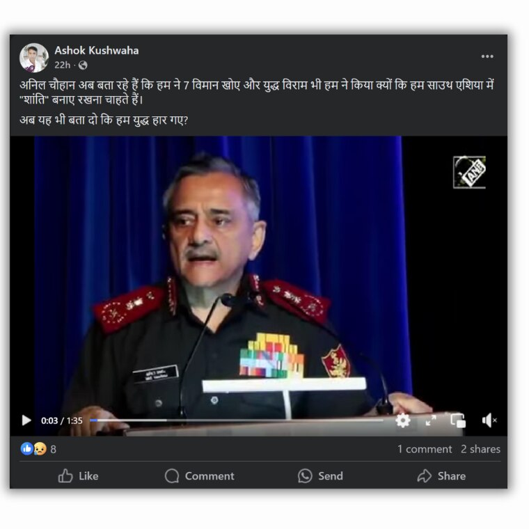 सेमिनार में सीडीएस चौहान मुख्य अतिथि थे और उन्होंने भाषण दिया था. इस भाषण में कहीं भी उन्होंने ऐसा नहीं कहा है कि पाकिस्तान के साथ संघर्ष के दौरान भारत ने सात विमान गंवाए थे या युद्ध विराम के लिए भारत ने अनुरोध किया था.