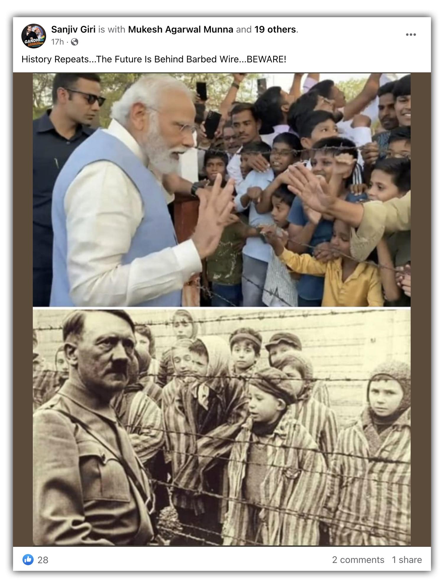 इस वाकये के संदर्भ में अब दो तस्वीरों का एक कोलाज सोशल मीडिया पर वायरल हो गया है. इसकी पहली फोटो में पीएम मोदी, कलबुर्गी में बच्चों से मुलाकात करते दिख रहे हैं. वहीं दूसरी फोटो में कथित तौर पर हिटलर कंटीले तारों के पीछे खड़े बच्चों से मिलता दिखाई दे रहा है.