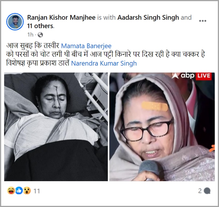 कोलाज के दूसरी ओर मौजूद फोटो में सीएम ममता हाथ में माइक पकड़े हुए हैं. इसमें उनके माथे के दायीं ओर बैंडेज लगा हुआ है. कई सोशल मीडिया यूजर्स इस कोलाज को शेयर करते हुए ममता बनर्जी के घायल होने की बात को झूठा बता रहे हैं.