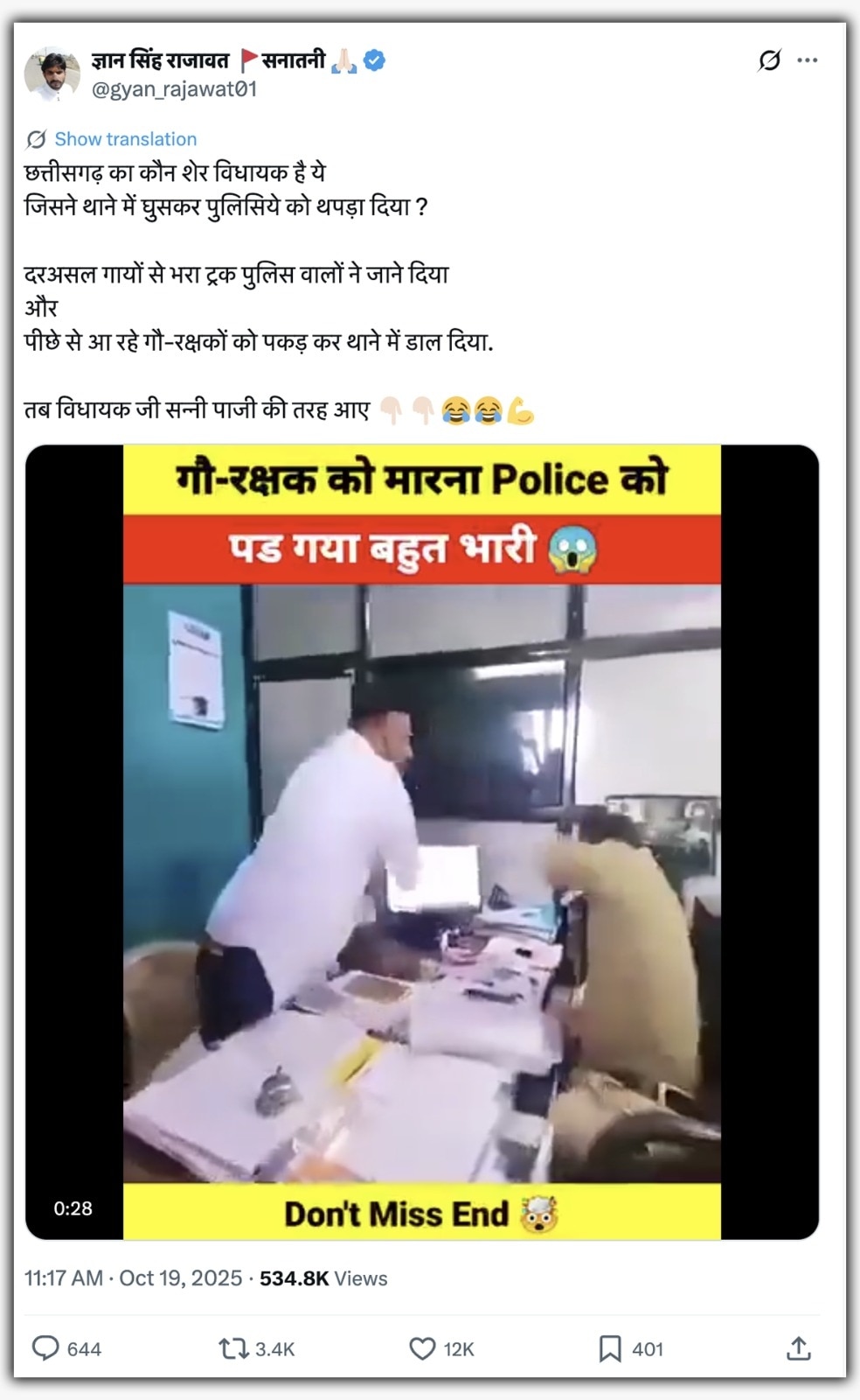 वीडियो को शेयर करते हुए एक व्यक्ति ने लिखा, “छत्तीसगढ़ का शेर विधायक है ये जिसने थाने में घुसकर पुलिसिये को थपड़ा दिया ? दरअसल गायों से भरा ट्रक पुलिस वालों ने जाने दिया और पीछे से आ रहे गौ-रक्षकों को पकड़ कर थाने में डाल दिया. तब विधायक जी सन्नी पाजी की तरह आए.”