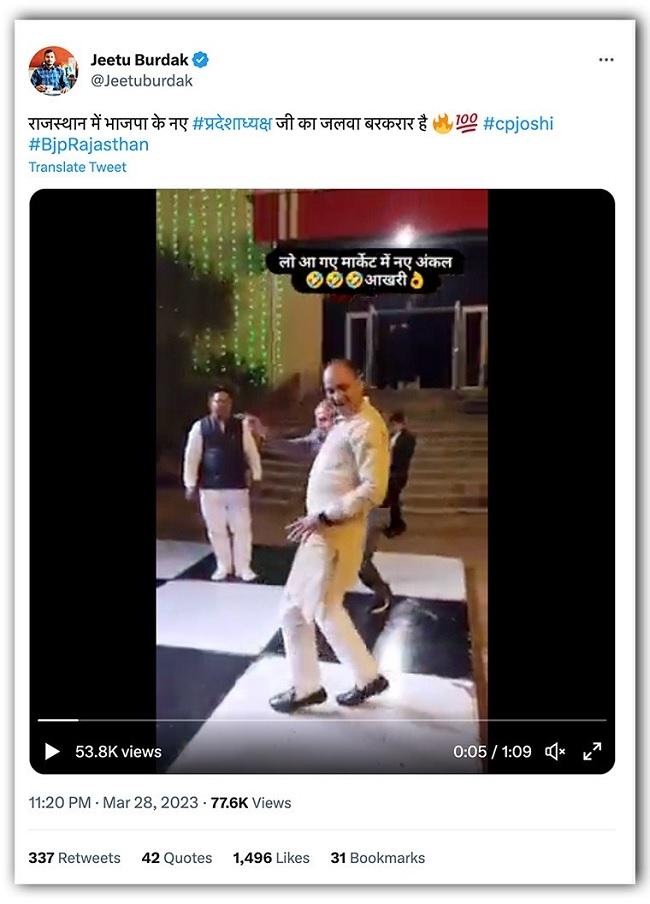 राजस्थान बीजेपी अध्यक्ष के रूप में सीपी जोशी की ताजपोशी के बाद से ही डांस वाला ये वीडियो उनके नाम पर शेयर किया जा रहा है. इसमें एक शख्स किसी पार्टी में 'यार मेरा तितलियां वरगा' गाने पर झूमता दिख रहा है. वीडियो में लिखा है, "लो आ गए मार्केट में नए अंकल. आखरी."