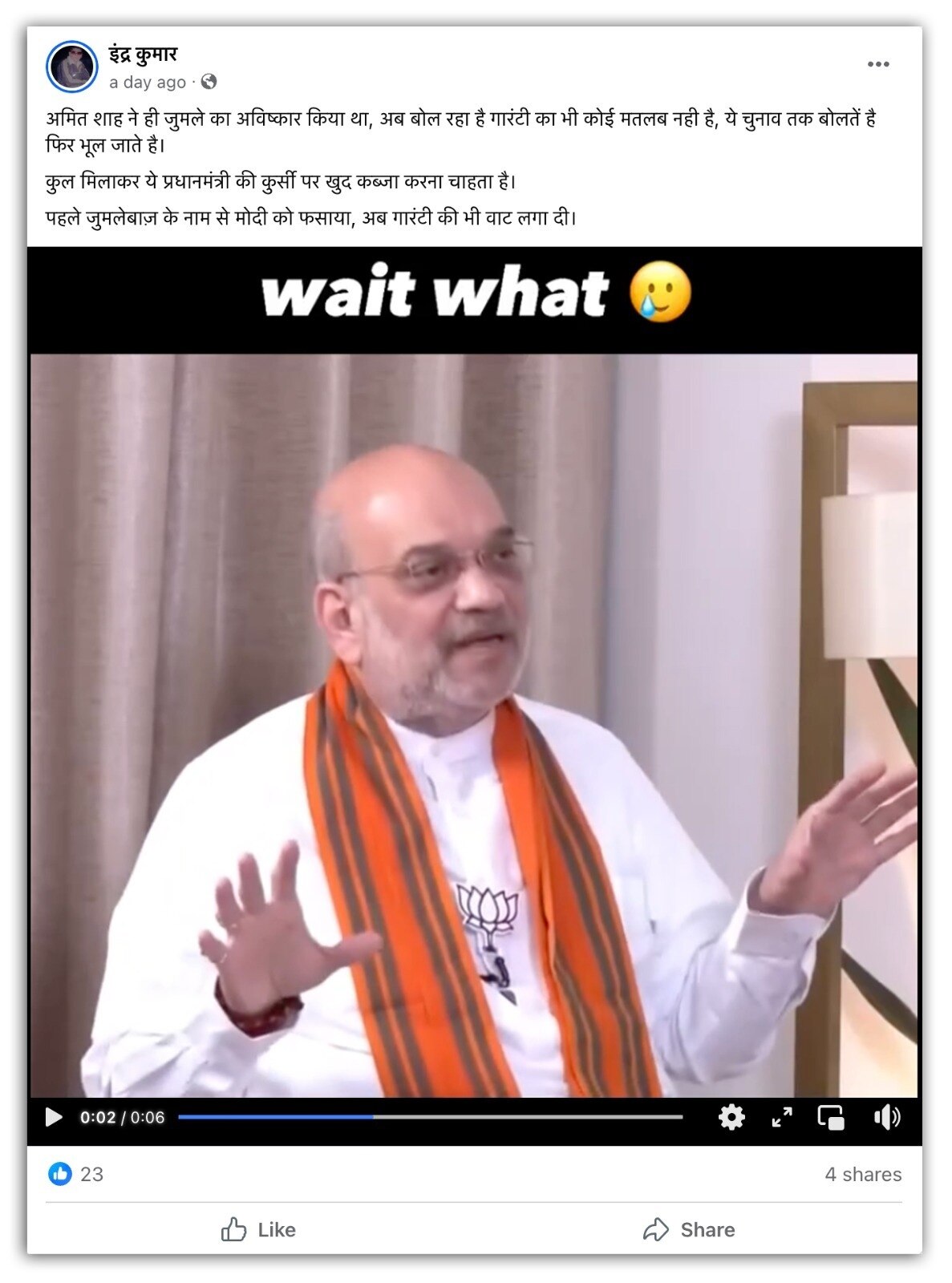 वीडियो को शेयर करते हुए एक फेसबुक यूजर ने लिखा, “अमित शाह जी ने ही जुमले का अविष्कार किया था, अब बोल रहे हैं गारंटी का भी कोई मतलब नहीं है. ये चुनाव तक बोलते हैं फिर भूल जाते है, कुल मिलाकर ये प्रधानमंत्री की कुर्सी पर खुद कब्जा करना चाहते हैं. पहले जुमलेबाज़ के नाम से मोदी को फसाया, अब गारंटी की भी वाट लगा दी.” इस पोस्ट का आर्काइव्ड वर्जन यहां देखा जा सकता है.