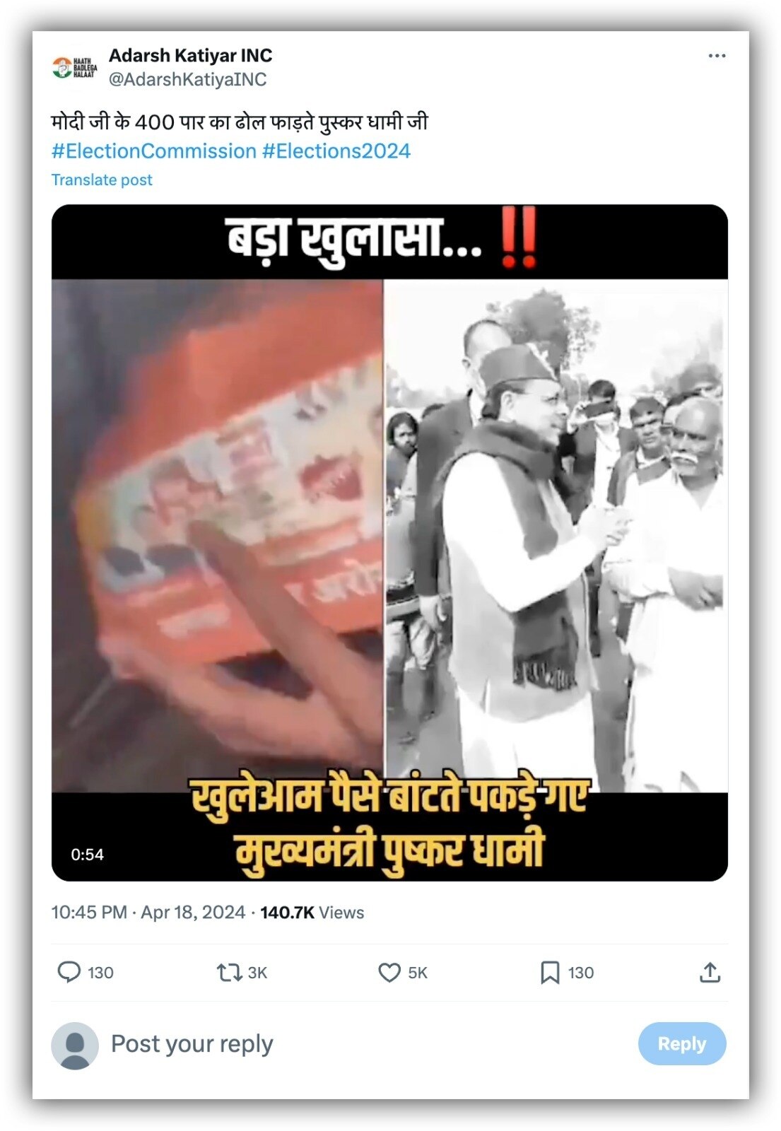 इस रिपोर्ट के मुताबिक वायरल वीडियो को आम आदमी पार्टी उत्तराखंड के आधिकारिक एक्स एकाउंट से शेयर किया गया था. 13 फरवरी को किये गए इस पोस्ट में 'आप' ने धामी पर सरेआम पैसे बांटने का आरोप लगाया था.