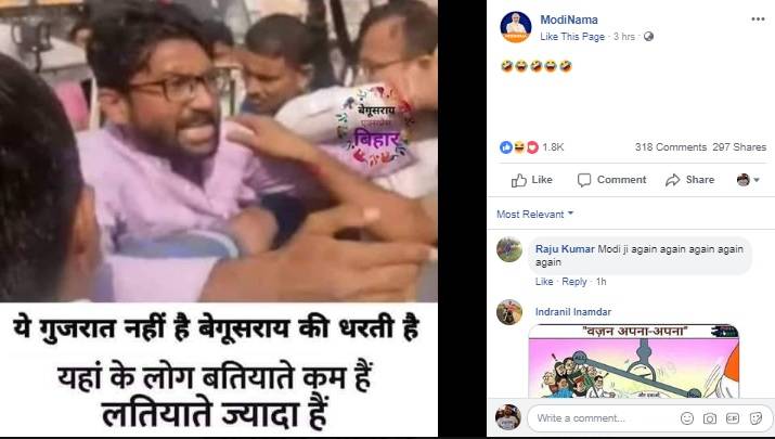 गुजरात के निर्दलीय विधायक जिग्नेश मेवाणी की एक फोटो सोशल मीडिया पर खूब धूम मचा रही है जिसमें वे लोगों से उलझते हुए दिखाई दे रहे हैं. फोटो के साथ दावा ये किया जा रहा है कि जिग्नेश मेवाणी और उनके साथियों को बेगूसराय के युवाओं ने जमकर पीटा. इस फोटो को ट्विटर यूजर मुरारी शरण शुक्ल ने ट्वीट किया.