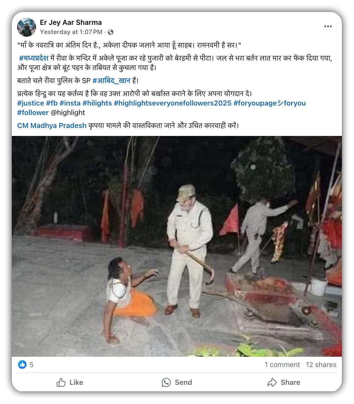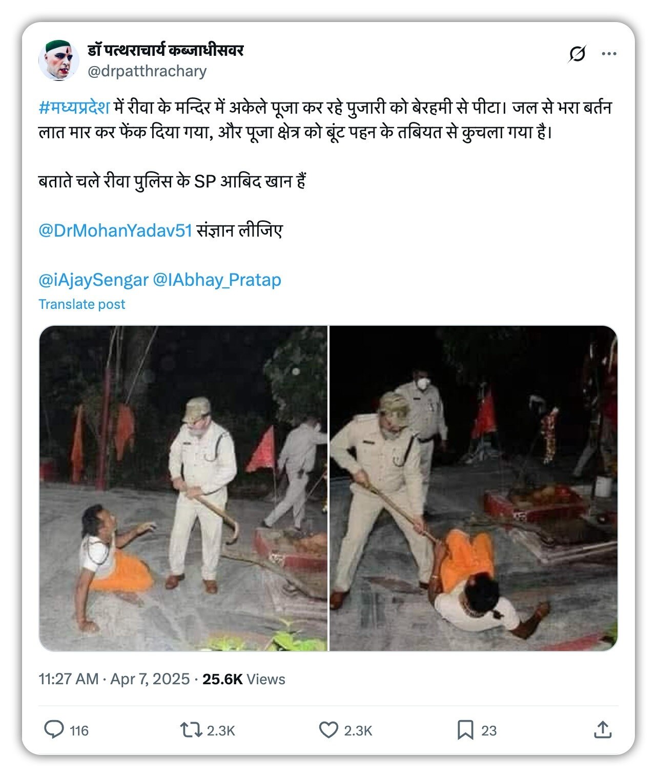 पोस्ट के कैप्शन में लिखा है, “मध्य प्रदेश में रीवा के मन्दिर में अकेले पूजा कर रहे पुजारी को बेरहमी से पीटा. जल से भरा बर्तन लात मार कर फेंक दिया गया, और पूजा क्षेत्र को बूंट पहन के तबियत से कुचला गया है. बताते चले रीवा पुलिस के SP आबिद खान हैं @DrMohanYadav51 संज्ञान लीजिए”.