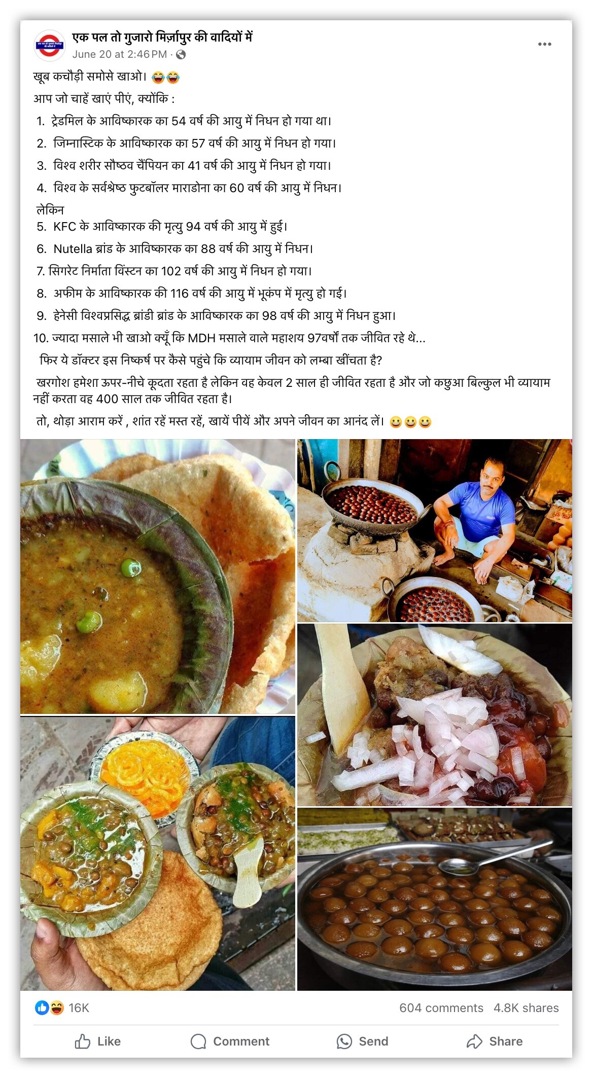 एक सोशल मीडिया पोस्ट के जरिये कुछ ऐसा ही दावा किया जा रहा है. इसमें लिखा है कि जब मन करे, कचौड़ी-जलेबी जैसी तली-भुनी चीजें खा लेनी चाहिए. बिना इस बात की परवाह किए कि इससे सेहत खराब होगी.