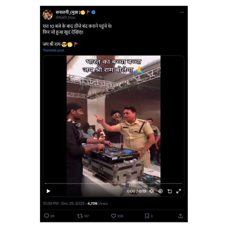 इसे पोस्ट करने वाले कई लोग कह रहे हैं कि ये पुलिसवाला असल में रात दस बजे के बाद किसी पार्टी में डीजे बंद करवाने पहुंचा था. लेकिन जब उसने देखा कि पार्टी में ‘भारत का बच्चा-बच्चा, जय श्री राम बोलेगा’ गाना बज रहा है, तो वो खुद भी डीजे के साथ इस गाने पर झूमने लगा.