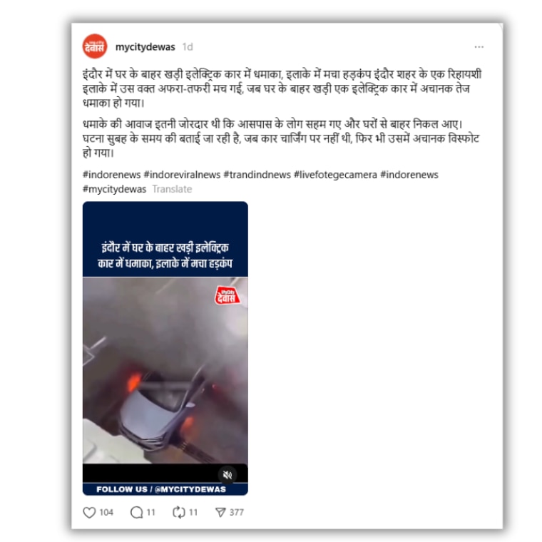 एक थ्रेड्स यूजर ने इस वीडियो को पोस्ट करते हुए लिखा, "इंदौर में घर के बाहर खड़ी इलेक्ट्रिक कार में धमाका, इलाके में मचा हड़कंप इंदौर शहर के एक रिहायशी इलाके में उस वक्त अफरा-तफरी मच गई, जब घर के बाहर खड़ी एक इलेक्ट्रिक कार में अचानक तेज धमाका हो गया. धमाके की आवाज इतनी जोरदार थी कि आसपास के लोग सहम गए और घरों से बाहर निकल आए. घटना सुबह के समय की बताई जा रही है, जब कार चार्जिंग पर नहीं थी, फिर भी उसमें अचानक विस्फोट हो गया."