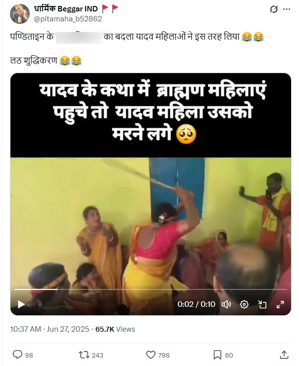 वीडियो को शेयर करते हुए एक फेसबुक यूजर ने लिखा, “यादव के कथा में ब्राह्मण महिलाएं पहुचे तो यादव महिला उसको मरने लगे पर हैं तो हिन्दू धर्म ना इतना नफरत क्यूँ जब से BJP की सरकार आया है तब से नफरती चालू हुआ है और इसका जिम्मेदार कोण हैं”. वायरल पोस्ट का आर्काइव्ड वर्जन यहां देखा जा सकता है.