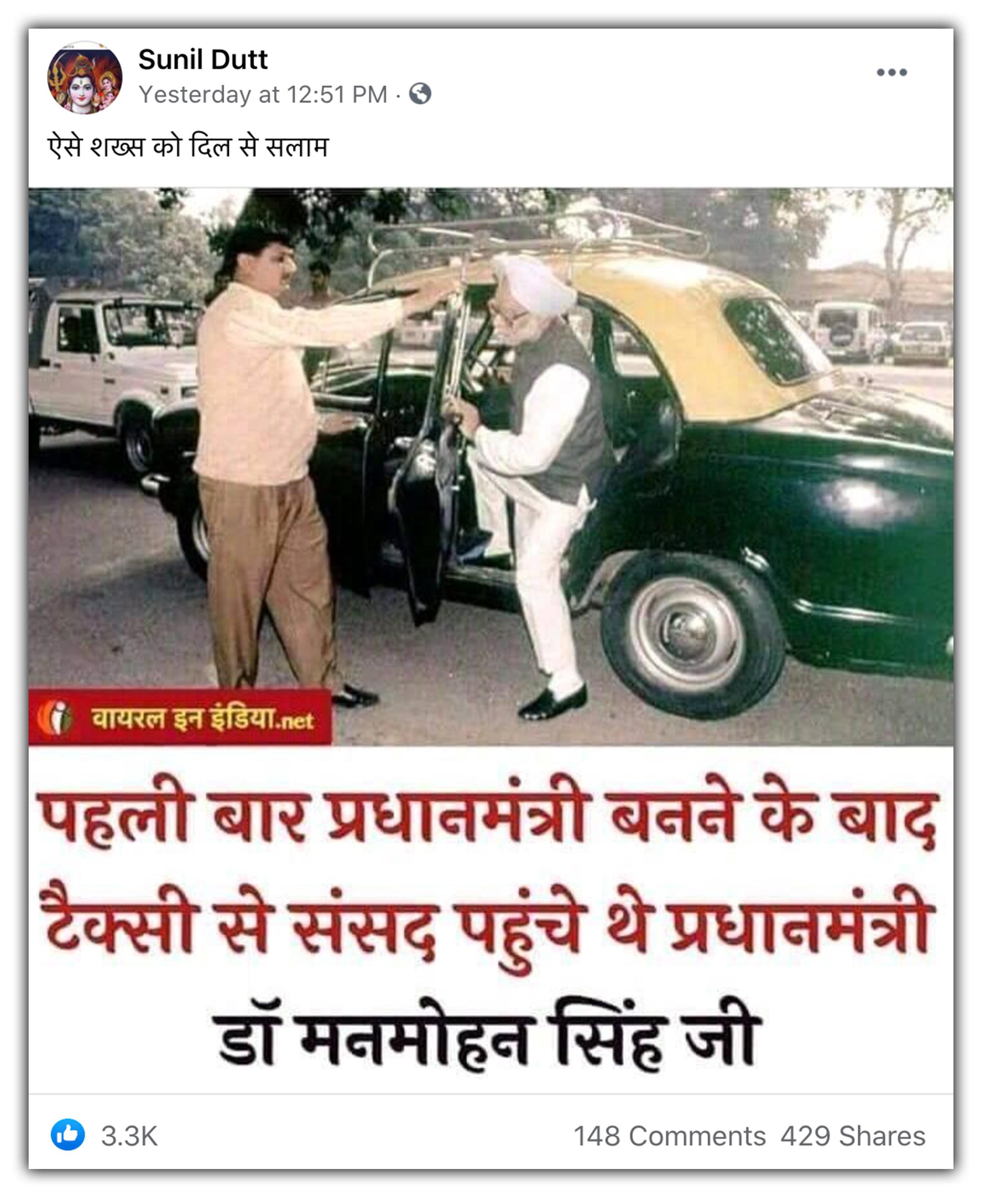 भारत में अगर प्रधानमंत्री टैक्सी से संसद भवन पहुंचे तो इस बात की चर्चा हर तरफ होगी. इसी को ध्यान में रखते हुए सोशल मीडिया पर पूर्व प्रधानमंत्री मनमोहन सिंह की एक तस्वीर वायरल हो रही है. तस्वीर के साथ दावा किया जा रहा है कि पहली बार प्रधानमंत्री बनने के बाद मनमोहन सिंह संसद भवन टैक्सी से पहुंचे थे. तस्वीर में मनमोहन सिंह को एक काली-पीली टैक्सी से उतरते हुए देखा जा सकता है. पोस्ट को शेयर करते हुए लोग मनमोहन सिंह की सादगी को लेकर उनकी तारीफ कर रहे हैं.