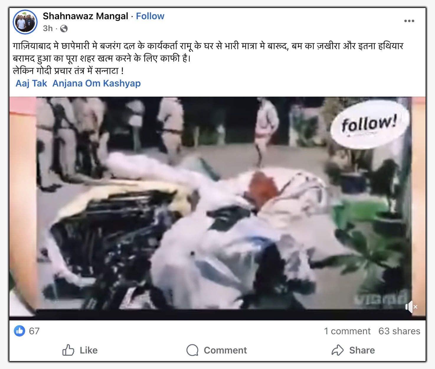 वीडियो को फेसबुक और एक्स जैसे प्लेटफॉर्म्स पर पोस्ट करते हुए एक व्यक्ति ने लिखा, “गाज़ियाबाद मे छापेमारी मे बजरंग दल के कार्यकर्ता रामू के घर से भारी मात्रा मे बारूद, बम का ज़खीरा और इतना हथियार बरामद हुआ का पूरा शहर खत्म करने के लिए काफी है. लेकिन गोदी प्रचार तंत्र में सन्नाटा!”