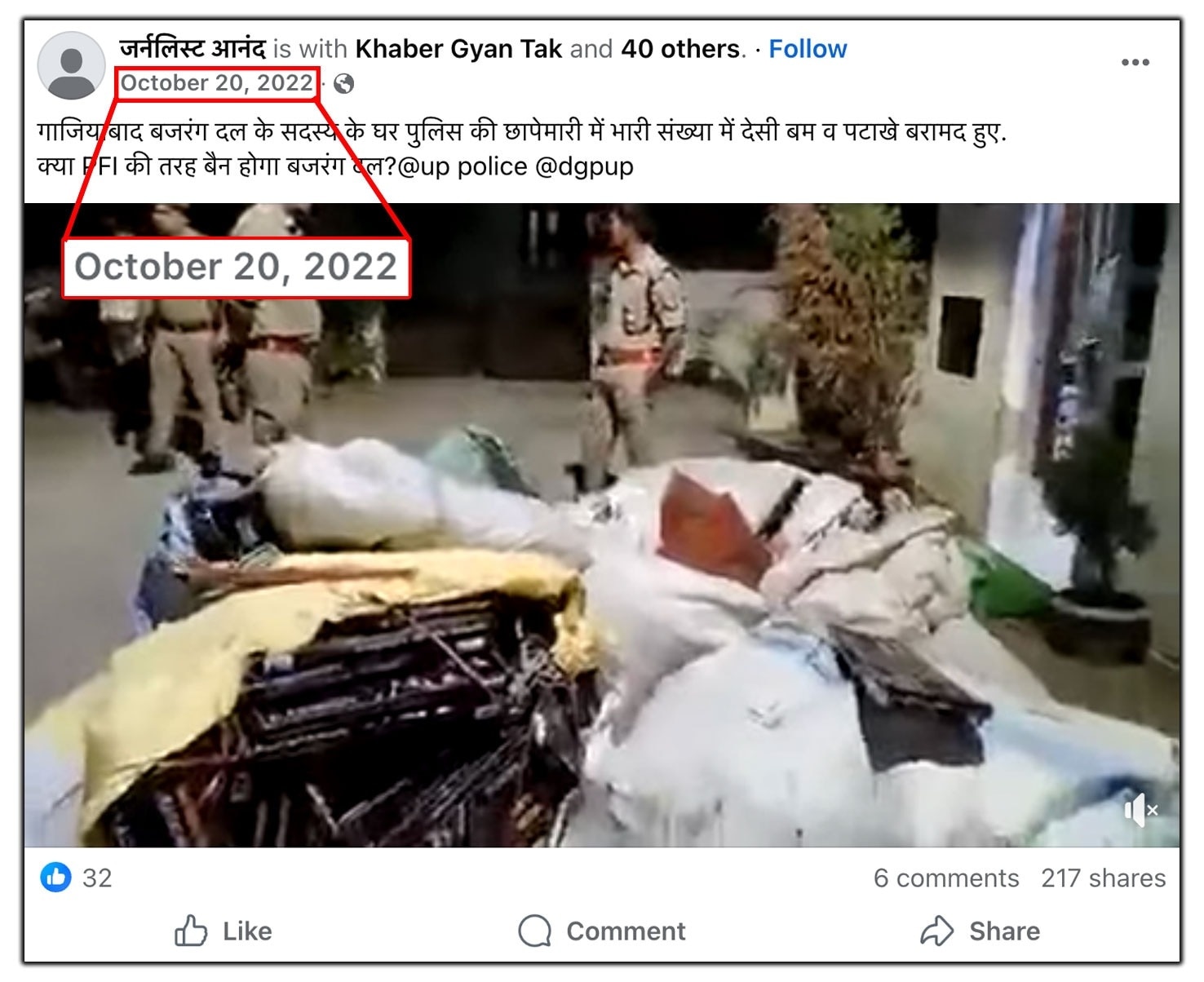 वायरल वीडियो के कीफ्रेम्स को रिवर्स सर्च करने पर हमें ये वीडियो एक फेसबुक पोस्ट में मिला. 20 अक्टूबर, 2022 को ये वीडियो पोस्ट करते हुए जर्नलिस्ट आनंद नाम के यूजर ने लिखा था, "गाजियाबाद बजरंग दल के सदस्य के घर पुलिस की छापेमारी में भारी संख्या में देसी बम व पटाखे बरामद हुए. क्या PFI की तरह बैन होगा बजरंग दल?@up police @dgpup". इससे एक बात तो साफ हो जाती है कि ये वीडियो किसी हालिया घटना का नहीं है, बल्कि कम से कम तीन साल पुराना है.