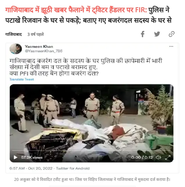 इस बारे में और पता करने पर हमें अक्टूबर 2022 में छपी ‘दैनिक भास्कर’ की एक रिपोर्ट मिली, जिसमें वायरल वीडियो के स्क्रीनशॉट का इस्तेमाल किया गया था. इस रिपोर्ट के मुताबिक, गाजियाबाद की इस घटना के बारे में झूठी खबर फैलाने के आरोप में पुलिस ने @YasmeenKhan_786 यूजर नेम वाले एक एक्स हैंडल के खिलाफ FIR दर्ज की थी. उस वक्त पुलिस ने रिजवान नामक शख्स के घर से अवैध पटाखे बरामद किए थे. लेकिन सोशल मीडिया पर ये बात फैलाई गई थी कि इस मामले का आरोपी बजरंग दल का सदस्य था.