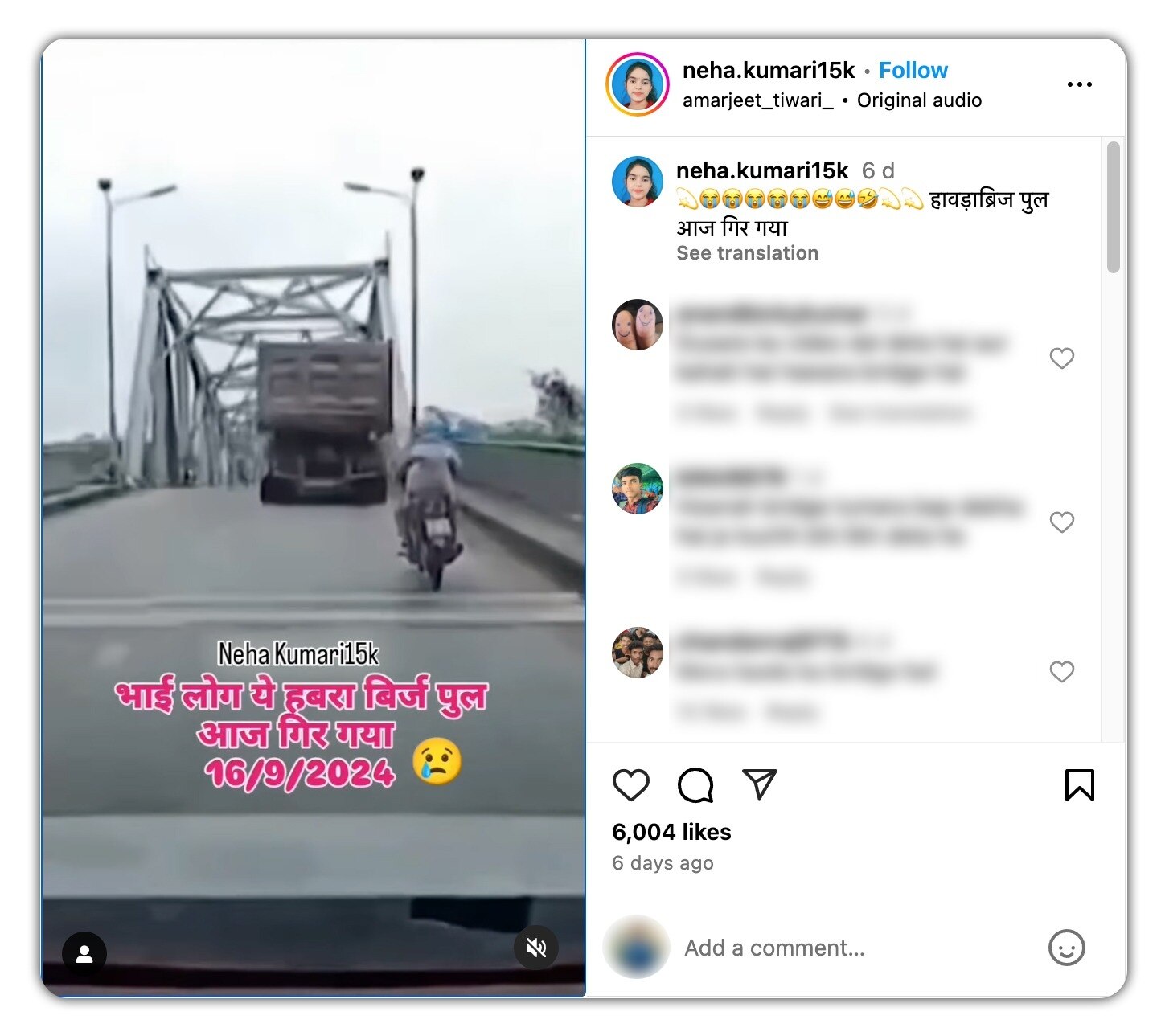 ऐसा कहा जा रहा है कि ये वीडियो 28 सितंबर, 2024 का है और हावड़ा ब्रिज का है. इस दावे के साथ ये वीडियो इंस्टाग्राम पर कई लोग शेयर कर चुके हैं. ऐसे ही एक वायरल पोस्ट का आर्काइव्ड वर्जन यहां देखा जा सकता है.