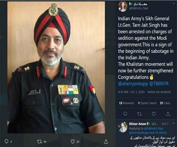 सोशल मीडिया पर वायरल एक दावे में यही कहा जा रहा है. वायरल पोस्ट में लेफ्टिनेंट जनरल तरनजीत सिंह की तस्वीर के साथ कैप्शन लिखा है, “भारतीय सेना के सिख लेफ्टिनेंट जनरल तरन जीत सिंह को मोदी सरकार के खिलाफ राजद्रोह करने की वजह से गिरफ्तार कर लिया गया है. यह भारतीय सेना के पतन की शुरुआत है. अब खलिस्तान अभियान और तेज होगा. बधाई!”