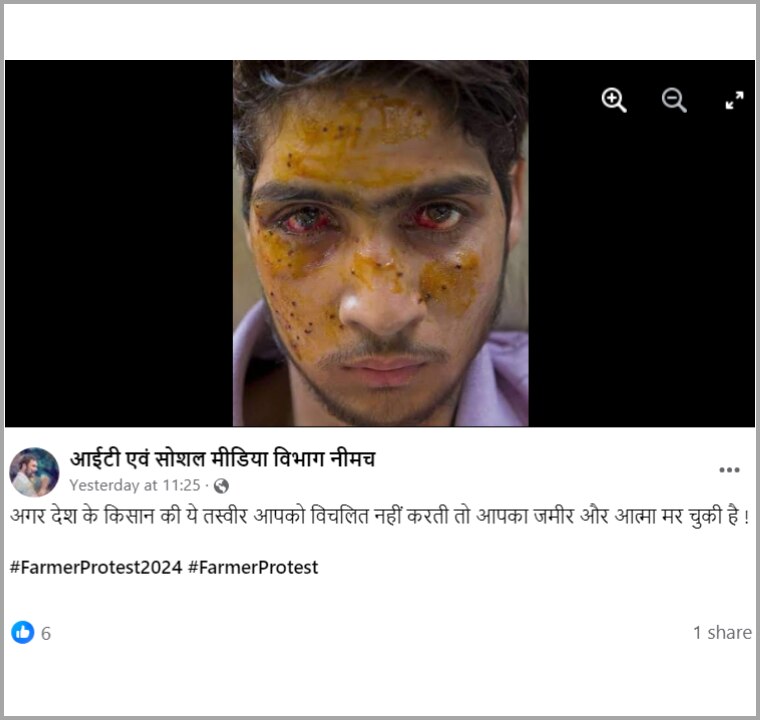 आजतक फैक्ट चेक ने पाया कि ये तस्वीर मोहम्मद इमरान नाम के एक शख्स की है, जिसपर कश्मीर पुलिस ने साल 2016 में पेलेट गन चलाई थी. इसका किसान आंदोलन से कोई लेना-देना नहीं है.