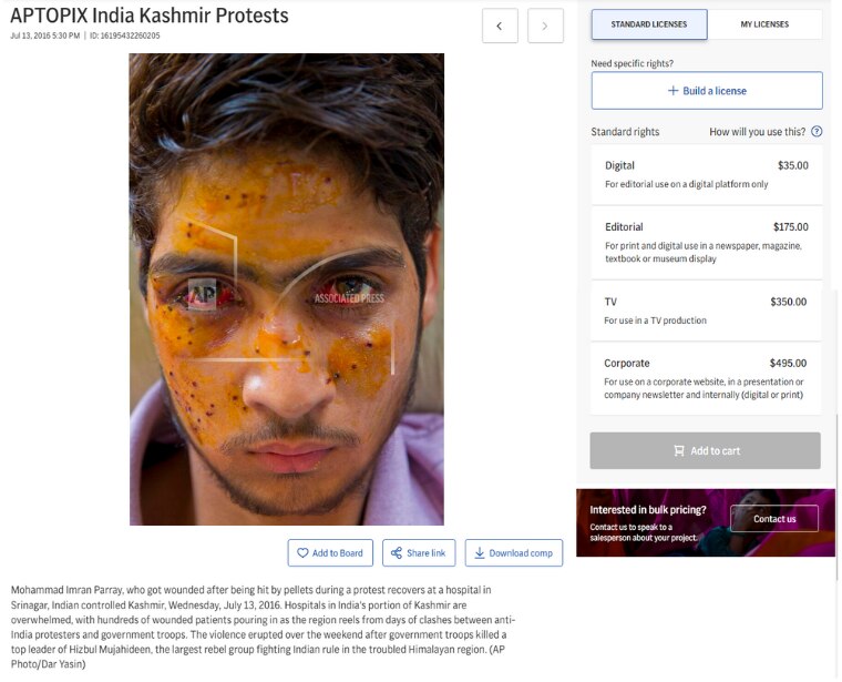 उस वक्त कश्मीर में पुलिस और प्रदर्शनकारियों के बीच चल रही झड़प के बारे में छपी कई मीडिया रिपोर्ट्स में इस शख्स की तस्वीर मौजूद हैं. वहीं, स्टॉक इमेज वेबसाईट ‘इल्मी’ पर इस फोटो के साथ जानकारी दी गई है कि ये तस्वीर ‘एसोसिएटेड प्रेस’ के फोटोग्राफर डार यासिन ने खींची है. इस जानकारी की मदद से हमने ‘एसोसिएटेड प्रेस’ की वेबसाइट पर ये फोटो खोज निकाली. यहां इसे पेलेट गन से जख्मी हुए मोहम्मद इमरान पारे का बताते हुए 13 जुलाई, 2016 को अपलोड किया गया है.
