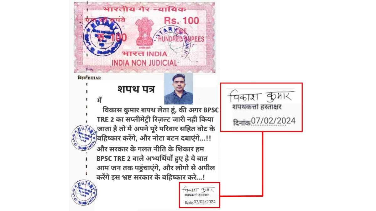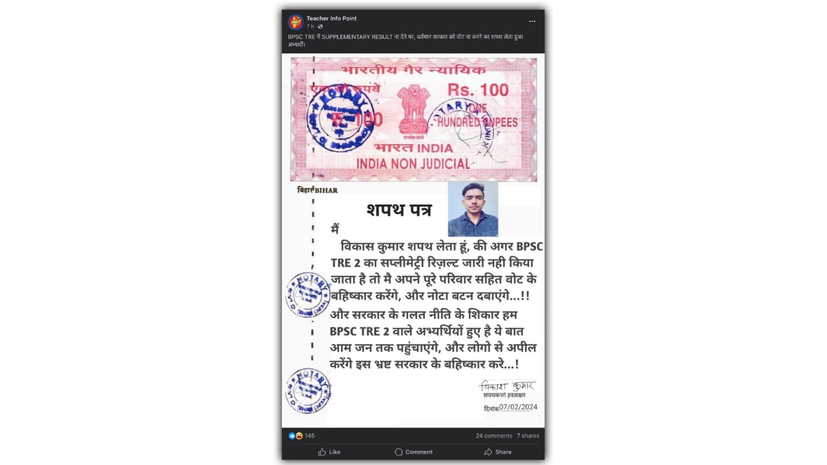 ऐसा ही एक पोस्ट सोशल मीडिया पर वायरल हो रहा है. इसमें एक स्टांप पेपर के जरिए दावा किया गया है कि एक अभ्यर्थी ने रिजल्ट न जारी होने पर चुनाव के दौरान पूरे परिवार सहित नोटा का बटन दबाने की शपथ ली है. देखने से पता चलता है कि ये गैर न्यायिक स्टाम्प पेपर बिहार में जारी किया गया है. इसमें हस्ताक्षरकर्ता की जगह किसी विकाश कुमार का नाम लिखा हुआ है. ऊपर किसी शख्स की पासपोर्ट साइज फोटो भी लगी हुई है.