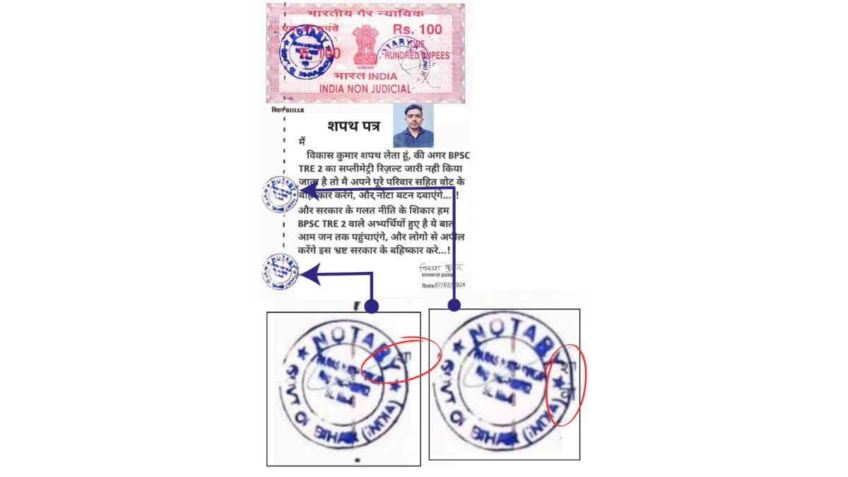 इस कथित स्टाम्प पेपर को शेयर करते हुए एक फेसबुक यूजर ने लिखा, “BPSC TRE में SUPPLEMENTARY RESULT ना देने पर, वर्तमान सरकार को वोट ना करने का शपथ लेता हुआ अभ्यर्थी.” आजतक फैक्ट चेक ने पाया कि वायरल स्टांप पेपर एडिटिंग के जरिए बनाया गया है.