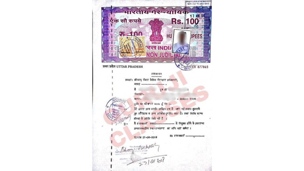 सही नोटराइज्ड स्टाम्प पेपर कुछ ऐसा दिखाई देता है. इसमें सीरियल नंबर, फोटो और हस्ताक्षर पर क्रॉस अटेस्टेशन आदि को देखा जा सकता है.