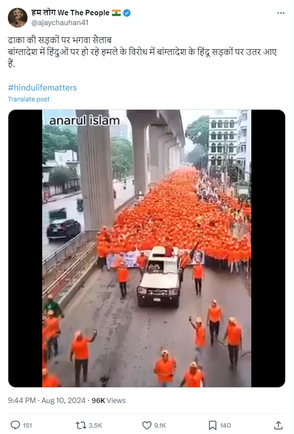 वायरल वीडियो को एक्स पर शेयर करते हुए एक यूजर ने लिखा, ढाका की सड़कों पर भगवा सैलाब, बांग्लादेश में हिंदुओं पर हो रहे हमले के विरोध में बांग्लादेश के हिंदू सड़कों पर उतर आए हैं. #hindulifematters”