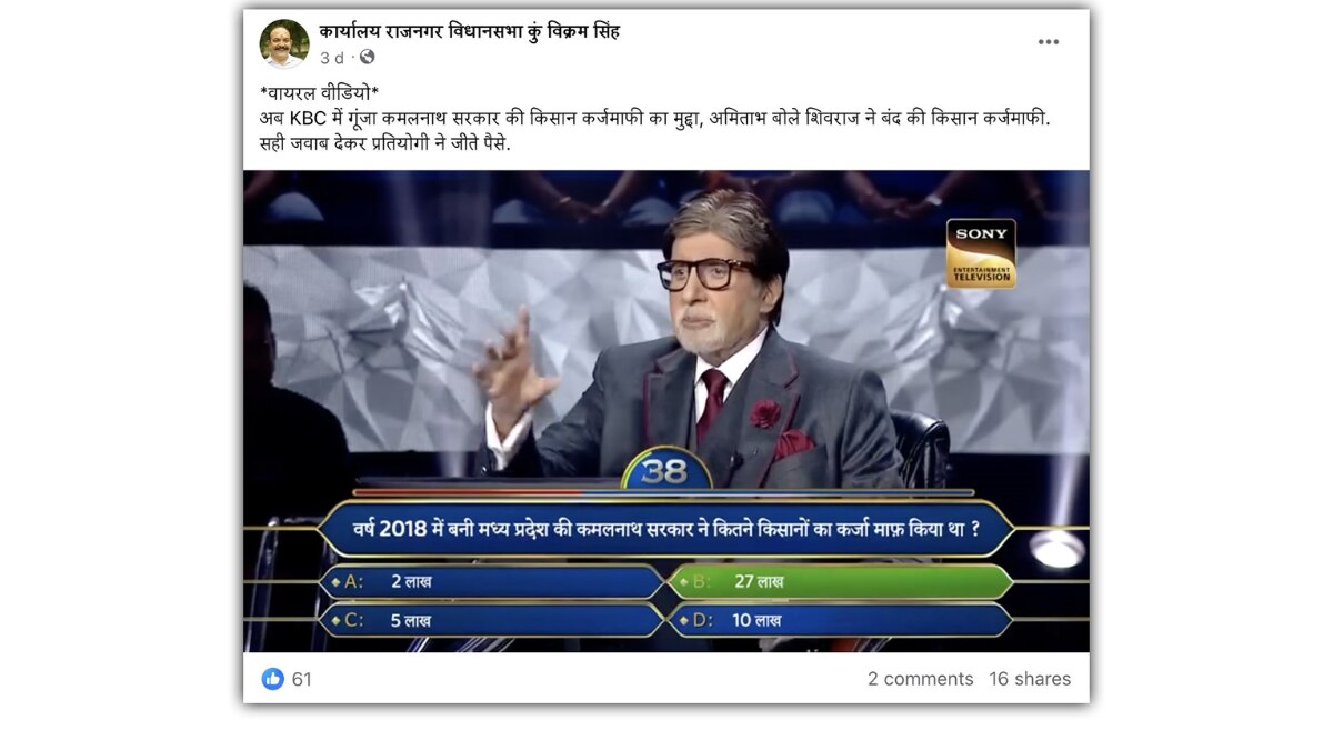 एक फेसबुक यूजर ने ये वीडियो शेयर करते हुए लिखा, "वायरल वीडियो. अब KBC में गूंजा कमलनाथ सरकार की किसान कर्जमाफी का मुद्दा, अमिताभ बोले शिवराज ने बंद की किसान कर्जमाफी. सही जवाब देकर प्रतियोगी ने जीते पैसे."