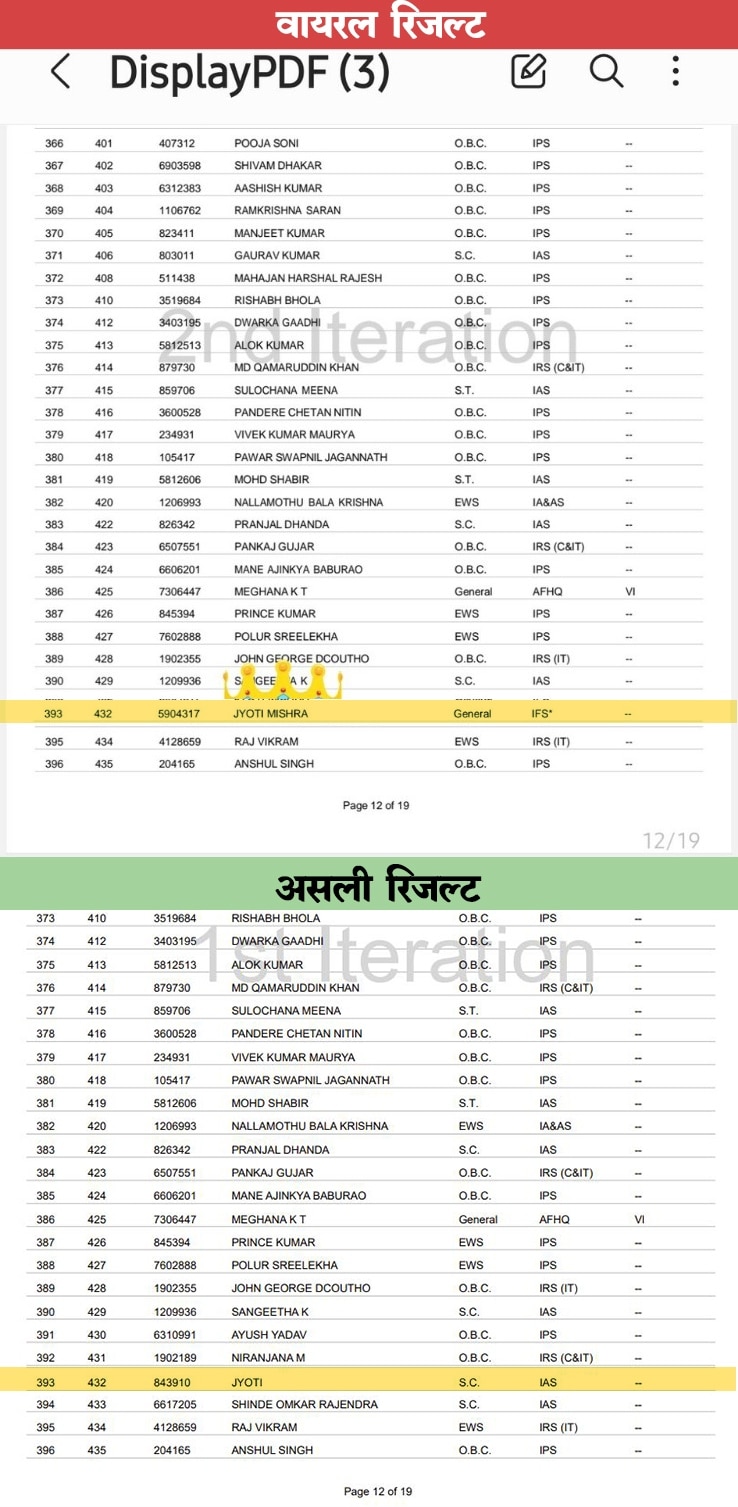 जिस लिस्ट में ज्योति मिश्रा के नाम के आगे जनरल लिखा है, वो एडिटेड है