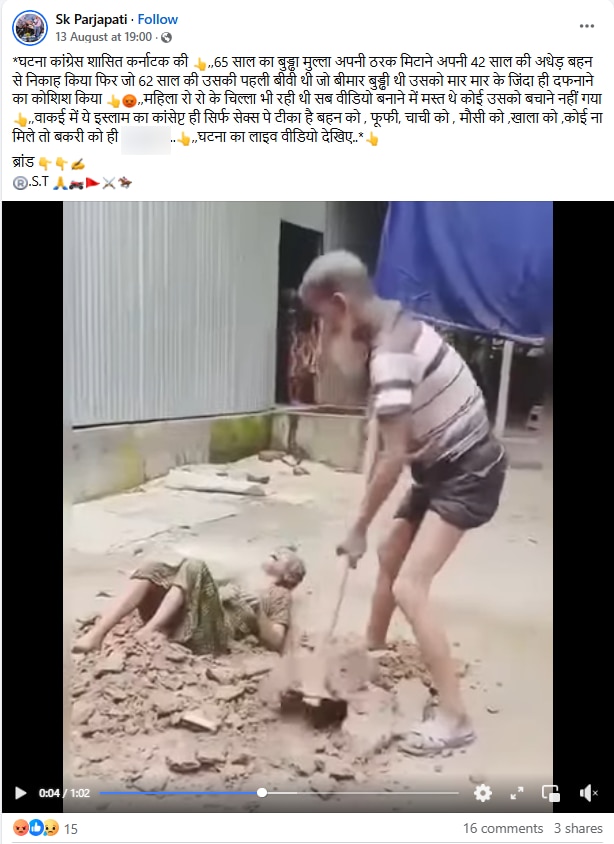 वीडियो के बारे में लोगों का कहना है कि इसमें दिख रहा व्यक्ति 65 साल का एक मुस्लिम है जिसने अपनी ही बहन से शादी कर ली और बाद में अपनी बीमार और बूढ़ी पत्नी को जिंदा दफनाने की कोशिश की. घटना कर्नाटक की बताते हुए कुछ लोग कांग्रेस सरकार को भी निशाने पर ले रहे हैं. ऐसे ही एक पोस्ट का आर्काइव वर्जन यहां देखा जा सकता है.