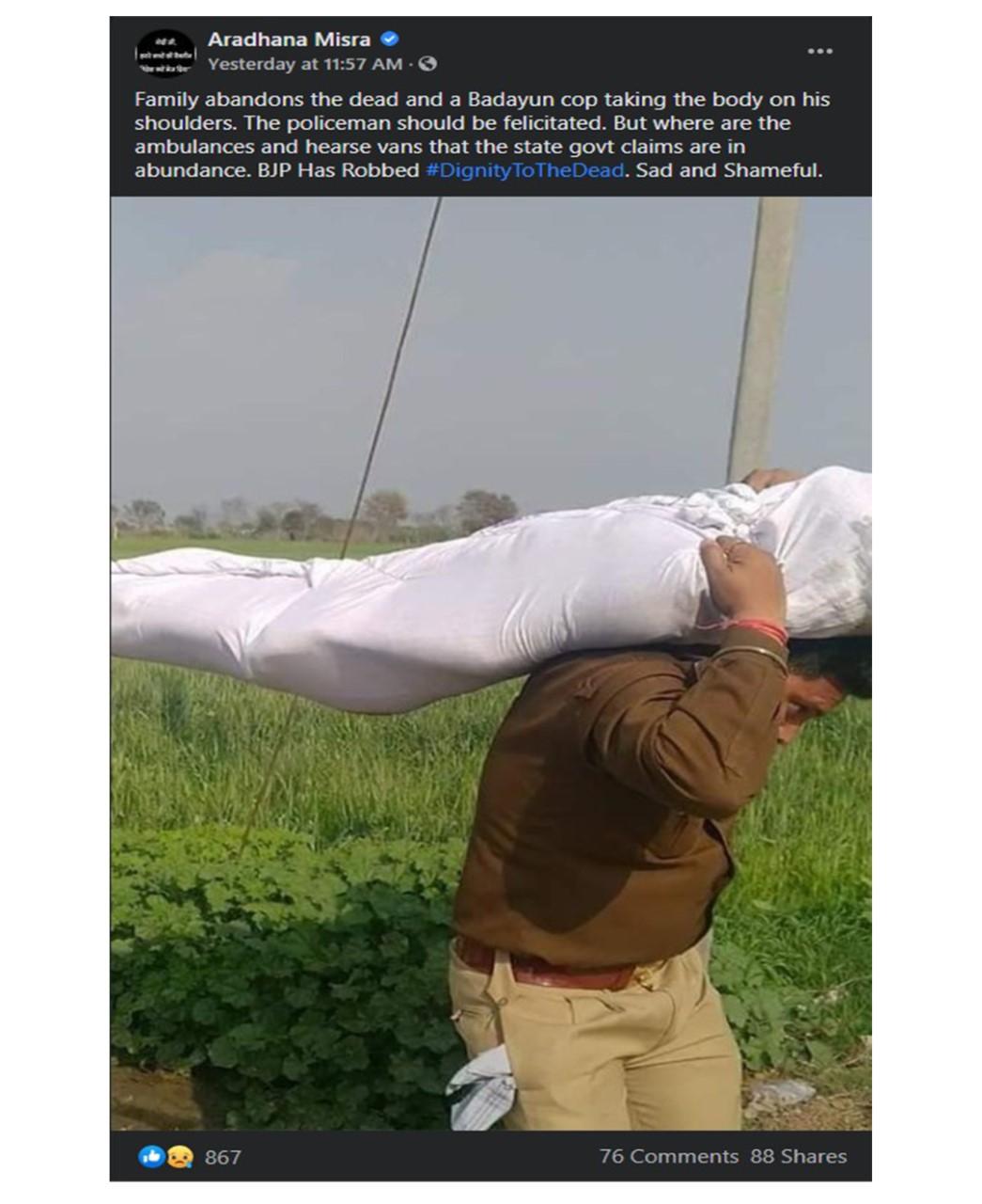 उत्तर प्रदेश के प्रतापगढ़ जिले की कांग्रेस विधायक आराधना मिश्रा ने इस फोटो को शेयर करते हुए अंग्रेजी में कैप्शन लिखा, जिसका हिंदी अनुवाद है, “ये पुलिसवाला एक ऐसे व्यक्ति के शव को अपने कंधों पर लेकर जा रहा है, जिसके परिवार तक ने उसे छोड़ दिया. इस पुलिसकर्मी का सम्मान किया जाना चाहिए. पर सवाल ये उठता है कि वो एम्बुलेंस और शवयान वाहन कहां हैं जिनकी पर्याप्त उपलब्धता का दावा सरकार कर रही है? भाजपा सरकार मृतकों को भी उचित सम्मान नहीं दे पा रही है. दुखद और शर्मनाक.”