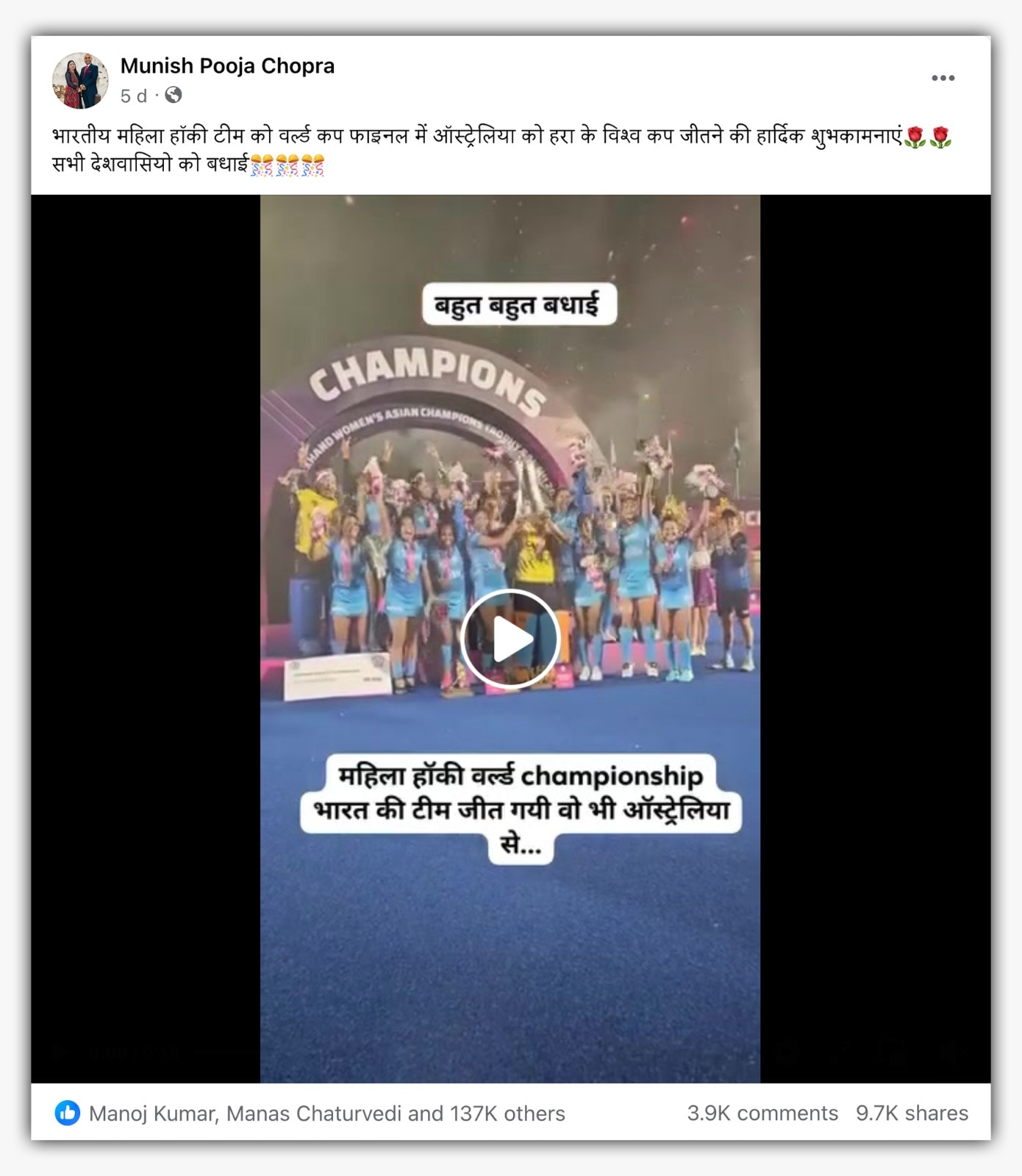 वीडियो के साथ लोग कैप्शन में लिख रहे हैं, “भारतीय महिला हॉकी टीम को वर्ल्ड कप फाइनल में ऑस्ट्रेलिया को हरा के विश्व कप जीतने की हार्दिक शुभकामनाएं सभी देशवासियो को बधाई”. इस कैप्शन के साथ ये वीडियो फेसबुक और ट्विटर पर काफी वायरल है. लोग वीडियो पर कमेंट कर रहे हैं कि भारत ने ऑस्ट्रेलिया से क्रिकेट में हार का बदला हॉकी में ले लिया.
