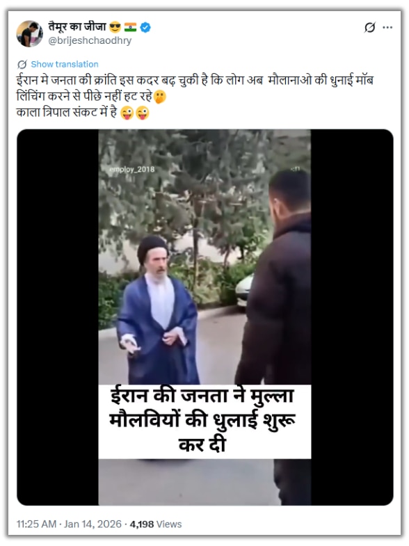 कुछ लोग इसे ईरान का हालिया वीडियो बताकर कह रहे हैं कि ईरान की जनता ने मौलवियों को सबक सिखाना शुरू कर दिया है. मिसाल के तौर पर वीडियो को एक्स पर शेयर करते हुए एक व्यक्ति ने लिखा, “ईरान मे जनता की क्रांति इस कदर बढ़ चुकी है कि लोग अब मौलानाओ की धुनाई मॉब लिंचिंग करने से पीछे नहीं हट रहे. काला त्रिपाल संकट में है.”