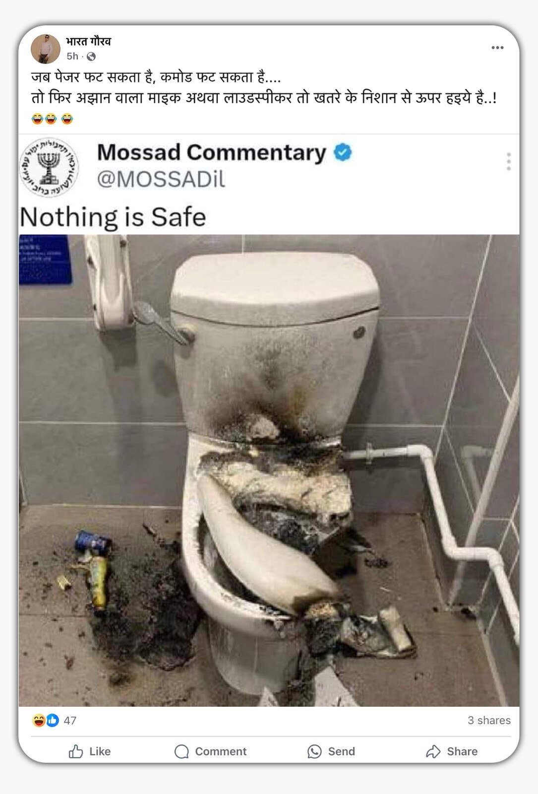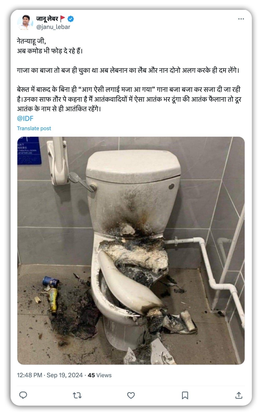 एक एक्स यूजर ने फोटो को पोस्ट करते हुए लिखा, “नेतन्याहू जी, अब कमोड भी फोड़ दे रहे हैं. गाजा का बाजा तो बज ही चुका था अब लेबनान का लैब और नान दोनो अलग करके ही दम लेंगे. बेरूत में बारूद के बिना ही “आग ऐसी लगाई मजा आ गया” गाना बजा बजा कर सजा दी जा रही है. उनका साफ तौर पे कहना है मैं आतंकवादियों में ऐसा आतंक भर दूंगा की आतंक फैलाना तो दूर आतंक के नाम से ही आतंकित रहेंगे”.