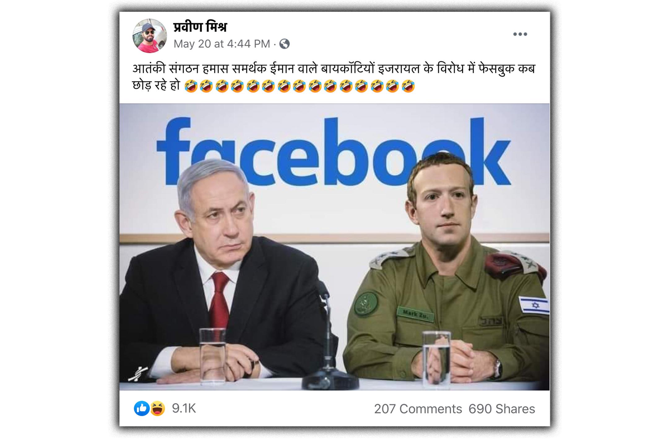 अब इसी को ध्यान में रखते हुए सोशल मीडिया पर एक तस्वीर वायरल हो रही है जिसमें इजरायल के प्रधानमंत्री बेंजामिन नेतन्याहू फेसबुक चीफ मार्क जुकरबर्ग के साथ बैठे दिख रहे हैं. तस्वीर के साथ तंज करते हुए फेसबुक यूजर्स सवाल कर रहे हैं कि फिलिस्तीनी आतंकी संगठन हमास के समर्थक या इजरायल का विरोध करने वाले लोग फेसबुक कब छोड़ने वाले हैं.