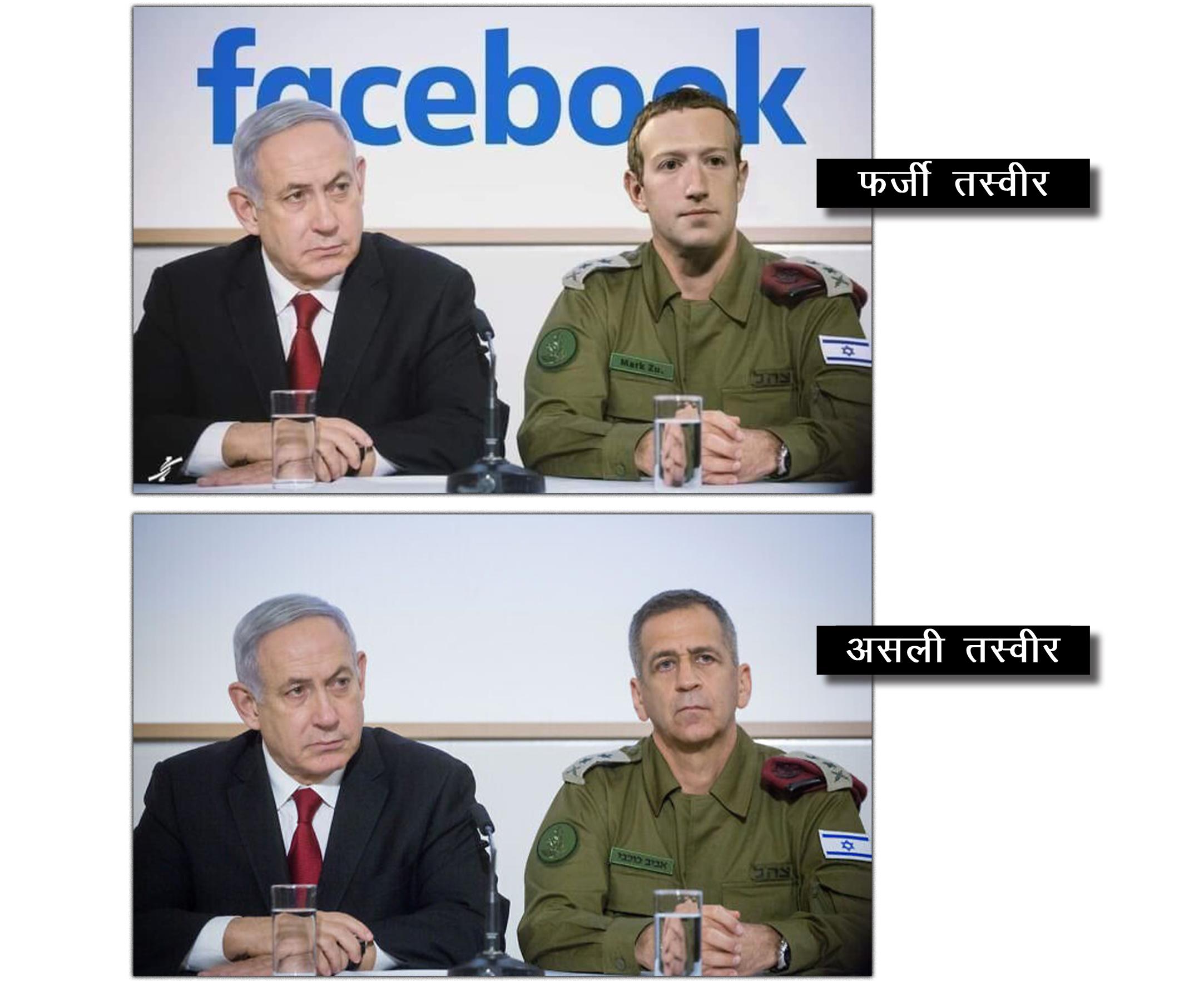 असली तस्वीर 12 नवंबर 2019 को इजरायली डिफेन्स फोर्स के तेल अवीव स्थित मुख्यालय में ली गई थी जब वहां अवीव कोचवि और बेंजामिन नेतन्याहू ने एक प्रेस वार्ता को संबोधित किया था. प्रेस वार्ता की अन्य तस्वीरें गेट्टी इमेजेस की वेबसाइट पर भी देखी जा सकती हैं. हालांकि, नेतन्याहू और जुकरबर्ग की 2009 में वर्ल्ड इकोनॉमिक फोरम के दौरान एक तस्वीर जरूर ली गई थी. लेकिन वायरल तस्वीर फर्जी है. इसे एडिटिंग सॉफ्टवेयर की मदद से बनाया गया है.
