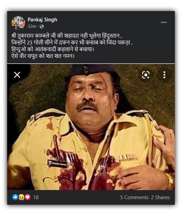 एक फेसबुक यूजर ने वायरल फोटो शेयर करते हुए लिखा, “श्री तुकाराम काम्बले जी की शहादत नही भूलेगा हिंदुस्तान, जिन्होंने 23 गोली सीने में दफन कर भी कसाब को जिंदा पकड़ा, हिन्दुओ को आतंकवादी कहलाने से बचाया. ऐसे वीर सपूत को शत शत नमन.”