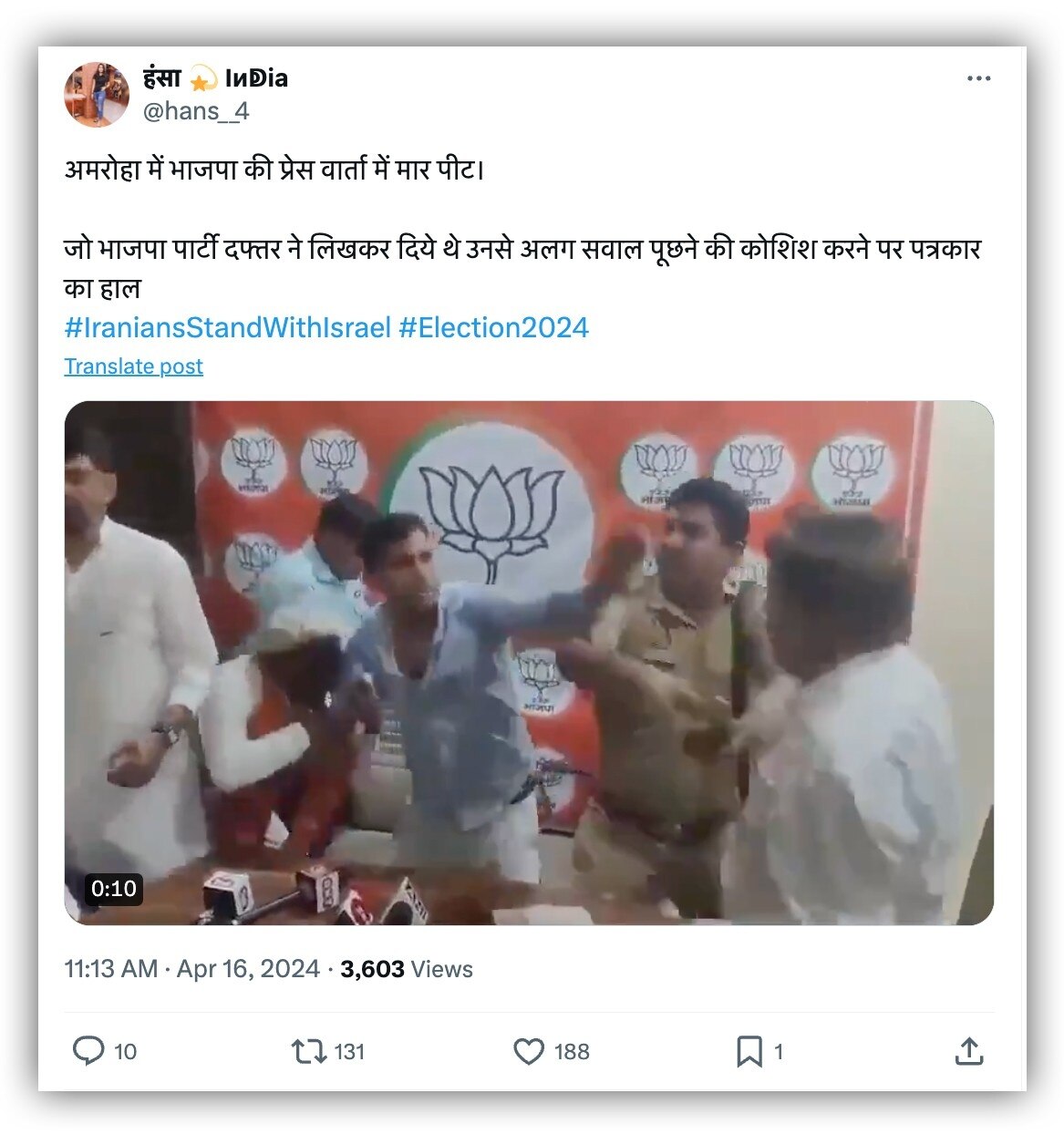 मिसाल के तौर पर, एक एक्स यूजर ने इस वीडियो को पोस्ट करते हुए लिखा, "अमरोहा में भाजपा की प्रेस वार्ता में मार पीट. जो सवाल पार्टी दफ्तर ने लिखकर दिये थे उनसे अलग सवाल पूछने की कोशिश कर रहा था पत्रकार."