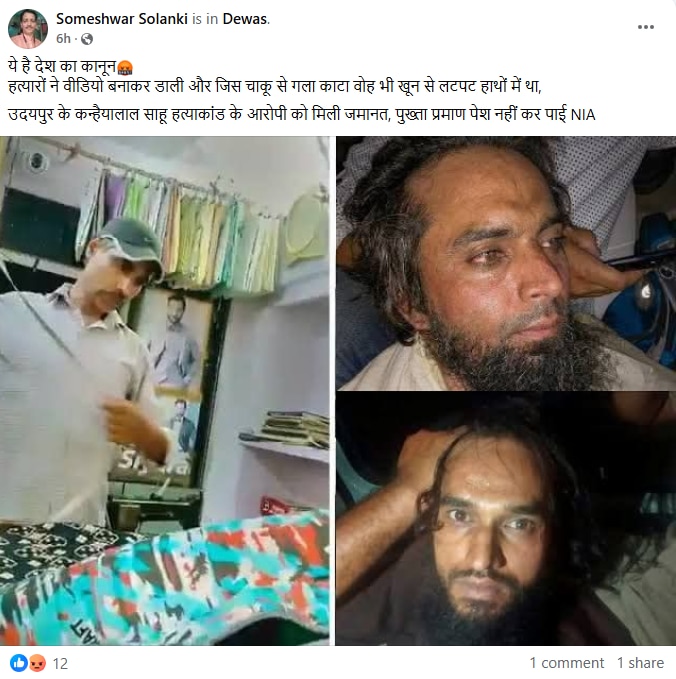 वीडियो को शेयर करते हुए एक फेसबुक यूजर ने लिखा, “ये है देश का कानून हत्यारों ने वीडियो बनाकर डाली और जिस चाकू से गला काटा वोह भी खून से लटपट हाथों में था, उदयपुर के कन्हैयालाल साहू हत्याकांड के आरोपी को मिली जमानत, पुख्ता प्रमाण पेश नहीं कर पाई NIA”.