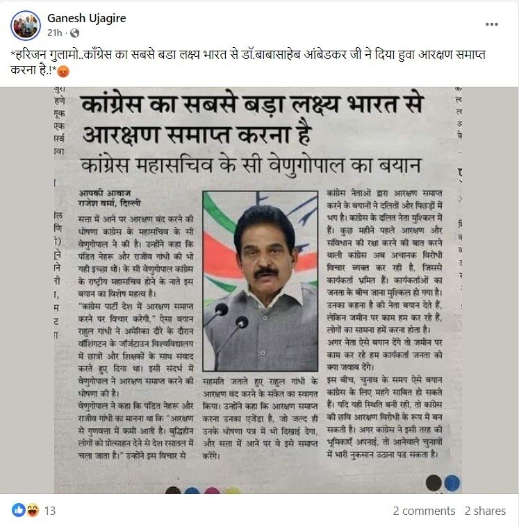 अखबार की इस कटिंग की हेडलाइन में और उसके नीचे लिखा है, "कांग्रेस का सबसे बड़ा लक्ष्य भारत से आरक्षण समाप्त करना है. कांग्रेस महासचिव के सी वेणुगोपाल का बयान." एक फेसबुक यूजर ने वायरल कटिंग को शेयर करते हुए लिखा, "हरिजन गुलामो..काँग्रेस का सबसे बडा लक्ष्य भारत से डॉ.बाबासाहेब आंबेडकर जी ने दिया हुवा आरक्षण समाप्त करना है." इस कथित अखबार की कटिंग को इन्हीं दावों के साथ एक्स पर भी शेयर किया गया है.