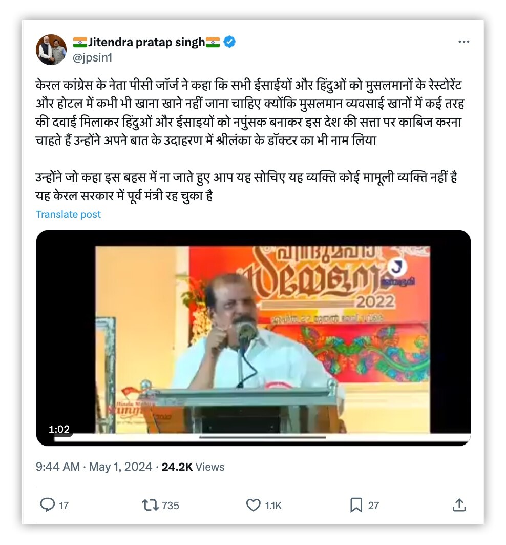 मिसाल के तौर पर, एक एक्स यूजर ने इस वीडियो को पोस्ट करते हुए लिखा, "केरल कांग्रेस के नेता पीसी जॉर्ज ने कहा कि सभी ईसाईयों और हिंदुओं को मुसलमानों के रेस्टोरेंट और होटल में कभी भी खाना खाने नहीं जाना चाहिए क्योंकि मुसलमान व्यवसाई खानों में कई तरह की दवाई मिलाकर हिंदुओं और ईसाइयों को नपुंसक बनाकर इस देश की सत्ता पर काबिज करना चाहते हैं उन्होंने अपने बात के उदाहरण में श्रीलंका के डॉक्टर का भी नाम लिया. उन्होंने जो कहा इस बहस में ना जाते हुए आप यह सोचिए यह व्यक्ति कोई मामूली व्यक्ति नहीं है यह केरल सरकार में पूर्व मंत्री रह चुका है."