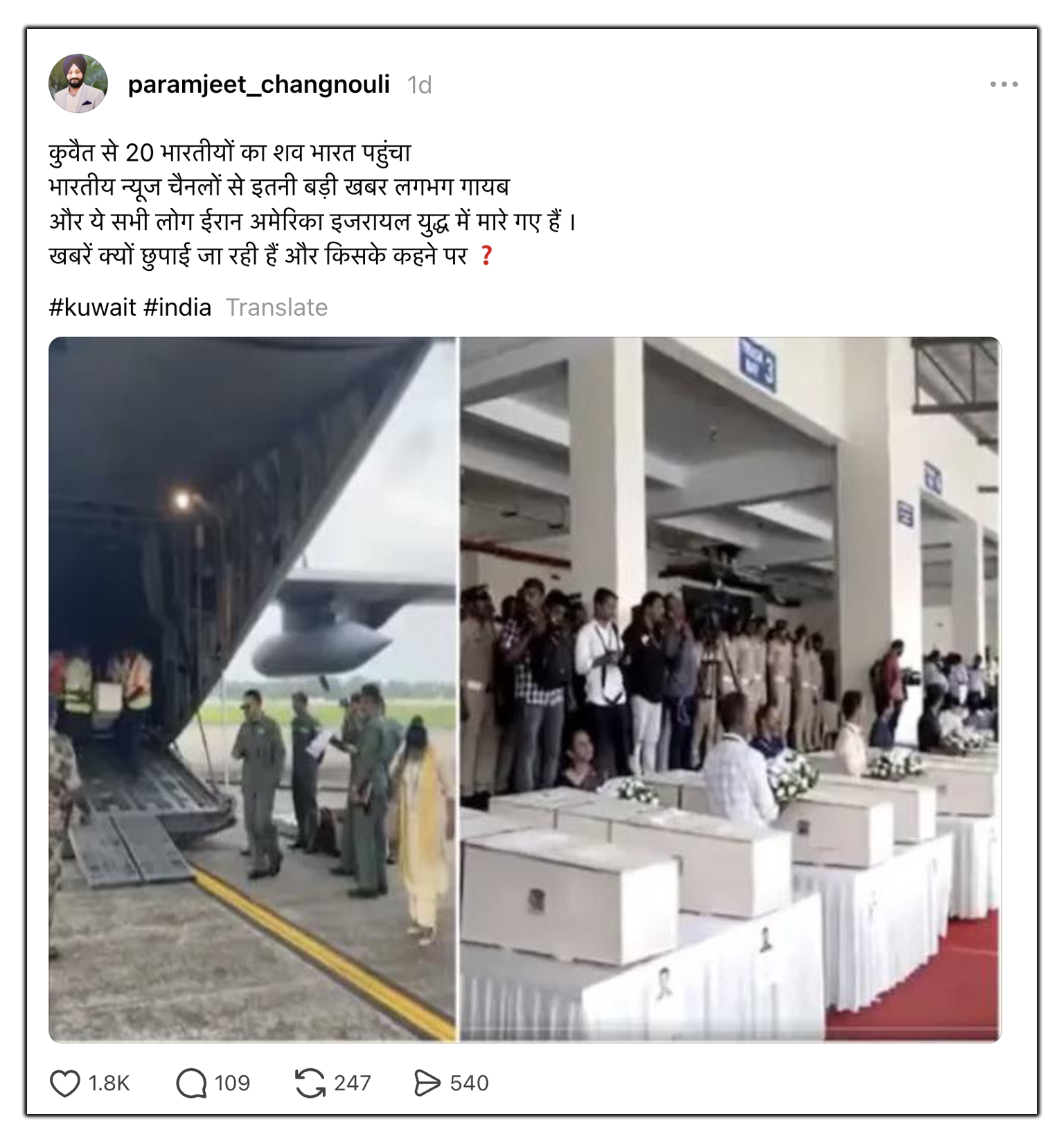 किसी विमान से निकाले जा रहे ताबूतों और उन ताबूतों के पास खड़े गमगीन लोगों की तस्वीरें शेयर करते हुए कुछ लोग कह रहे हैं कि ये कुवैत से लाए गए 20 भारतीयों के शव हैं, जो मध्य पूर्व युद्ध की भेंट चढ़ गए.