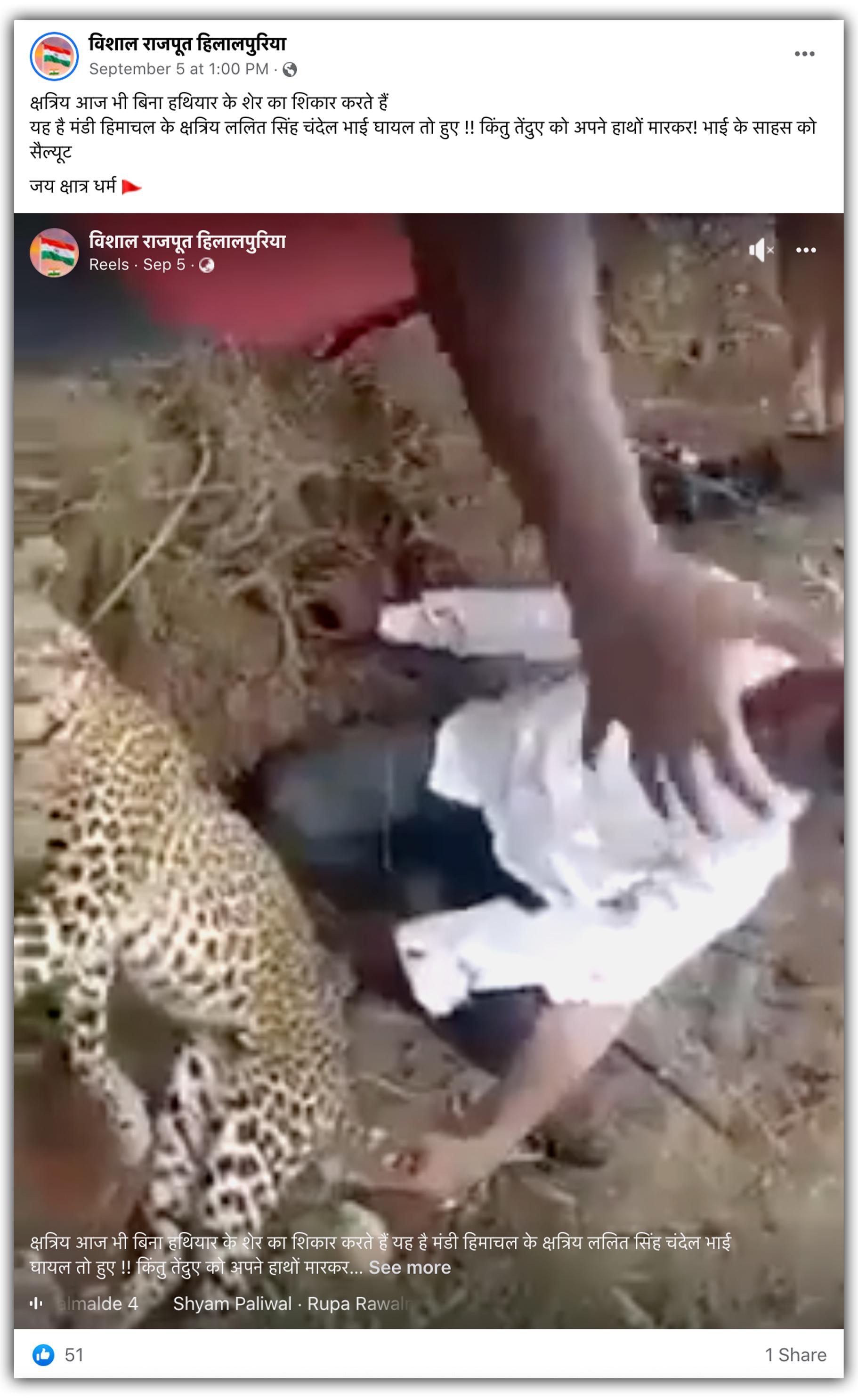 एक फेसबुक यूजर ने इस वीडियो को शेयर करते हुए लिखा, “क्षत्रिय आज भी बिना हथियार के शेर का शिकार करते हैं यह है मंडी हिमाचल के क्षत्रिय ललित सिंह चंदेल भाई घायल तो हुए !! किंतु तेंदुए को अपने हाथों मारकर! भाई के साहस को सैल्यूट जय क्षात्र धर्म.”
