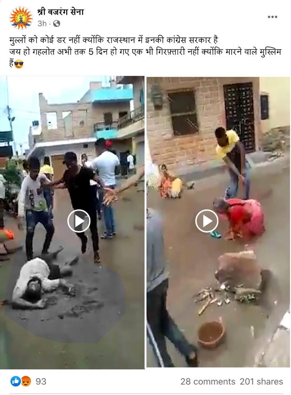 वीडियो के कैप्शन में लिखा है "मुल्लों को कोई डर नहीं क्योंकि राजस्थान में इनकी कांग्रेस सरकार है जय हो गहलोत अभी तक 5 दिन हो गए एक भी गिरफ़्तारी नहीं क्योंकि मारने वाले मुस्लिम हैं. इसी कैप्शन के साथ वीडियो फेसबुक और ट्विटर पर घूम रहा है.